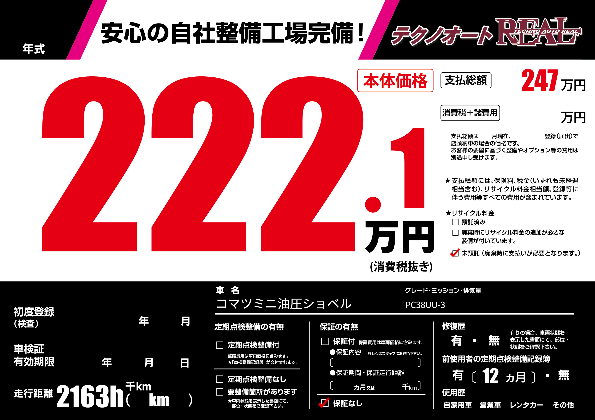 | 車名 | コマツミニ油圧ショベル | グレード ミッション 排気量 |