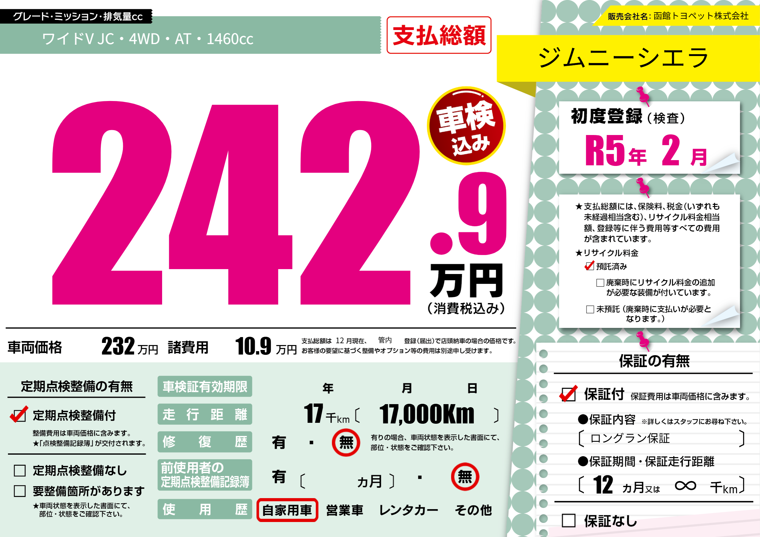 | 車名 | ジムニーシエラ | グレード ミッション 排気量 |