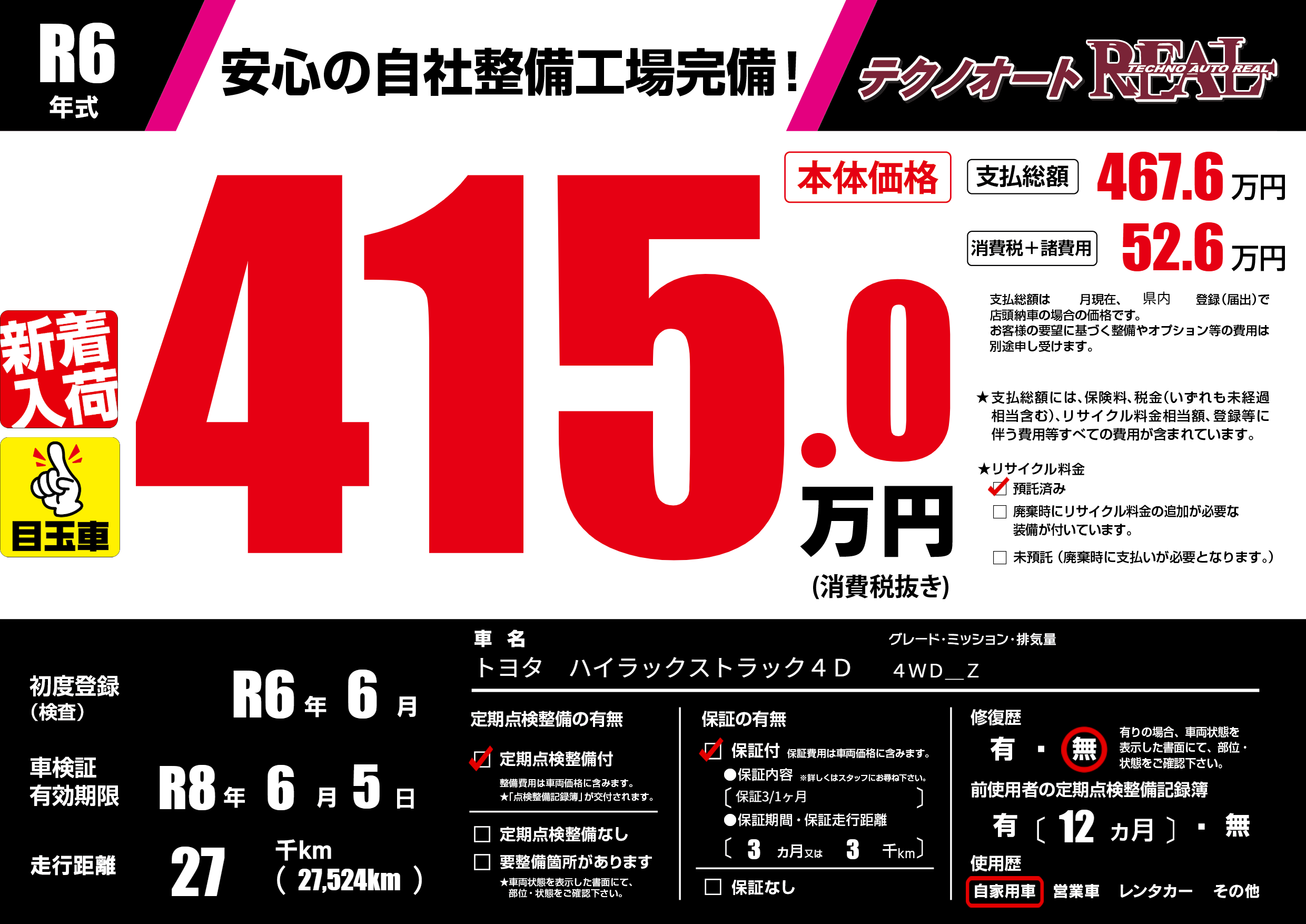 | 走行キロ | 2.7万km | 初年度登録 | R6年6月 |