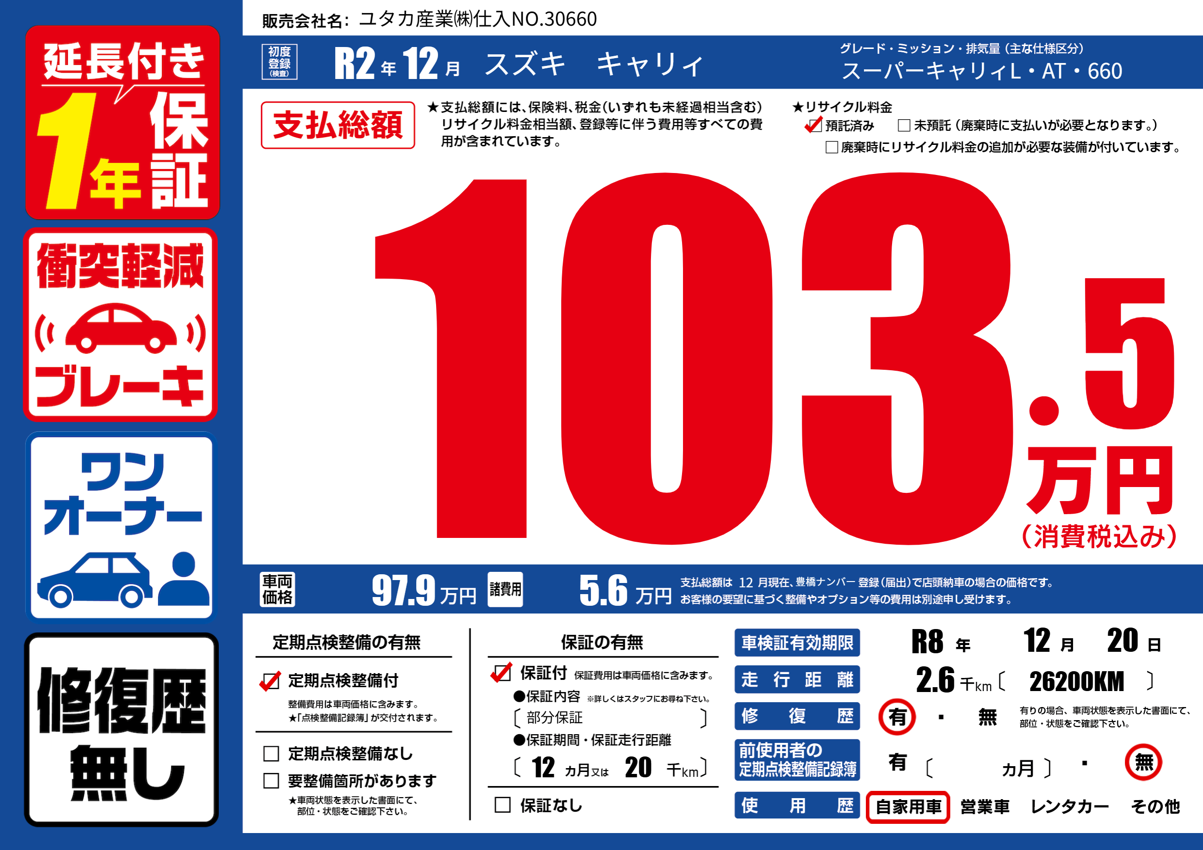 保証付き 保証内容(部分保証) 12ヶ月または(20)千kmまで |