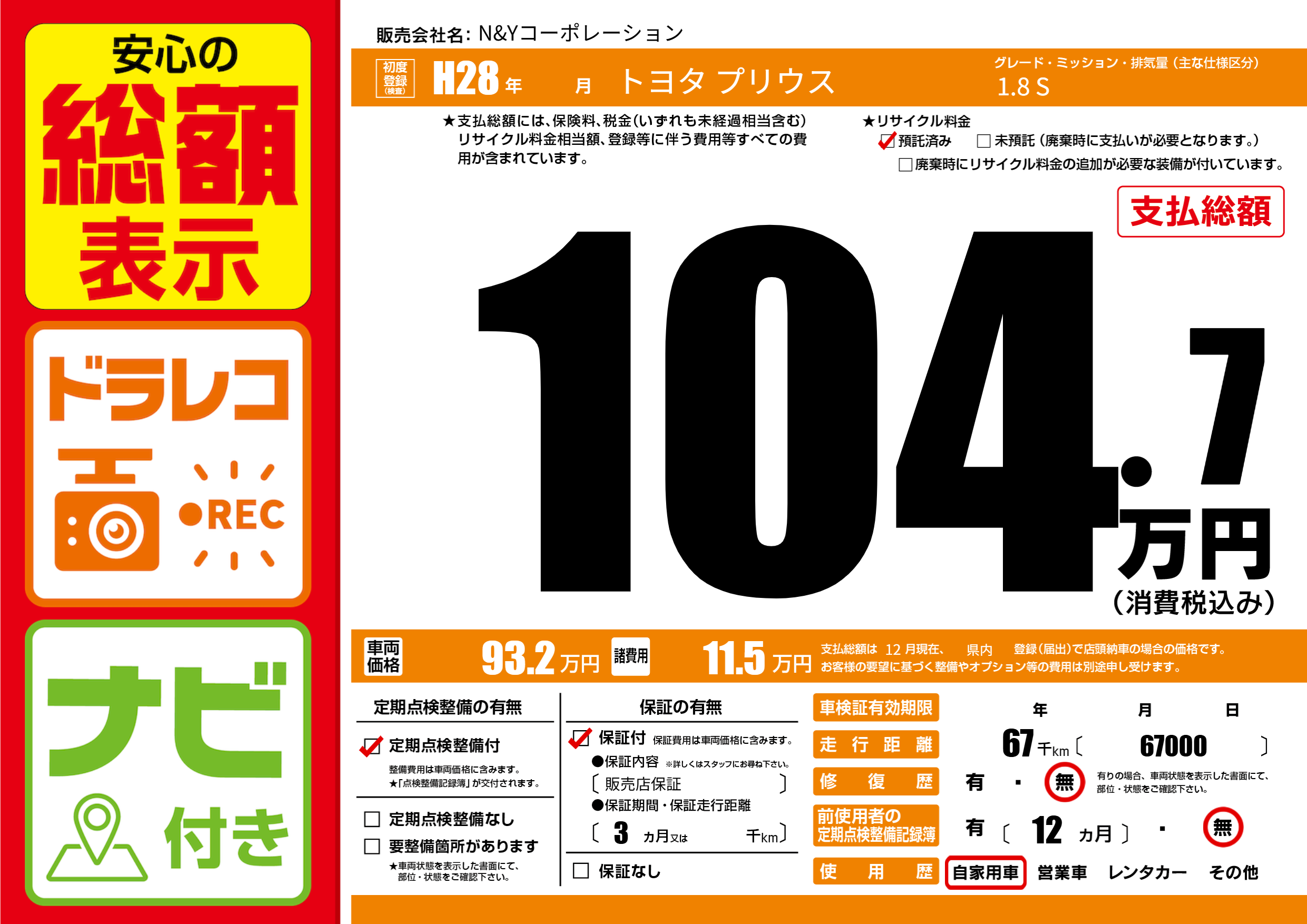 | 車名 | トヨタ プリウス | グレード ミッション 排気量 |