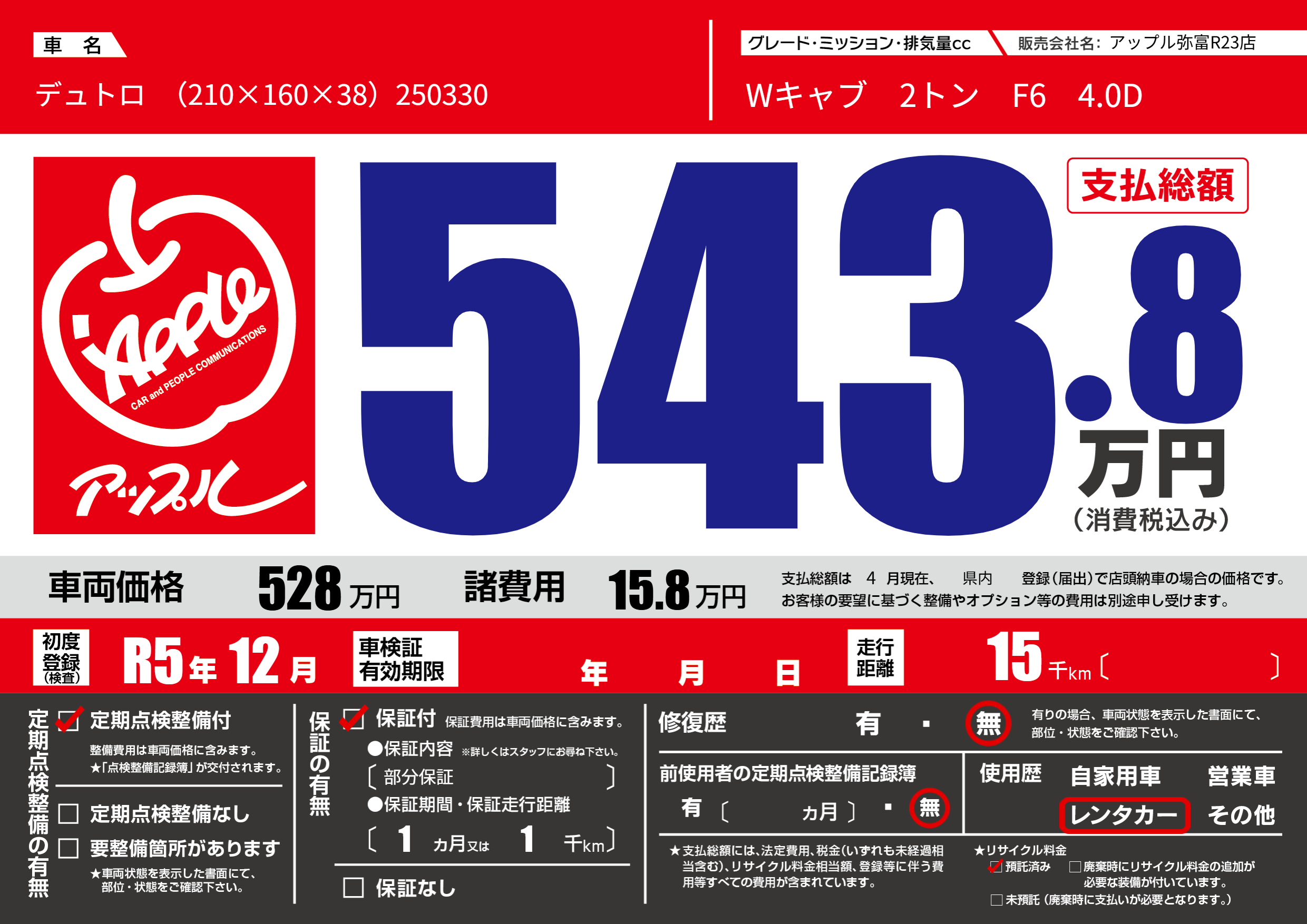 | 車名 | デュトロ (210×160×38)250330 | グレード ミッション 排気量 |