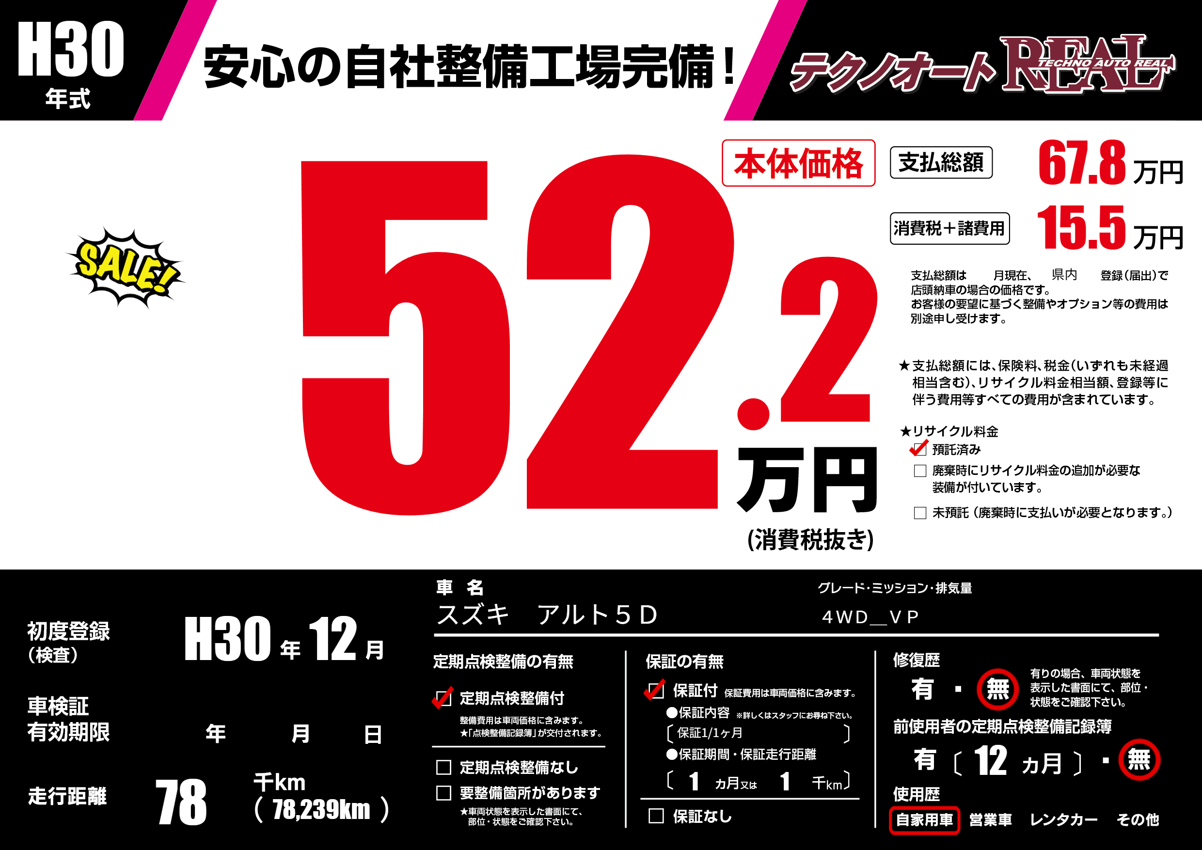 | 走行キロ | 7.8万km | 初年度登録 | H30年12月 |