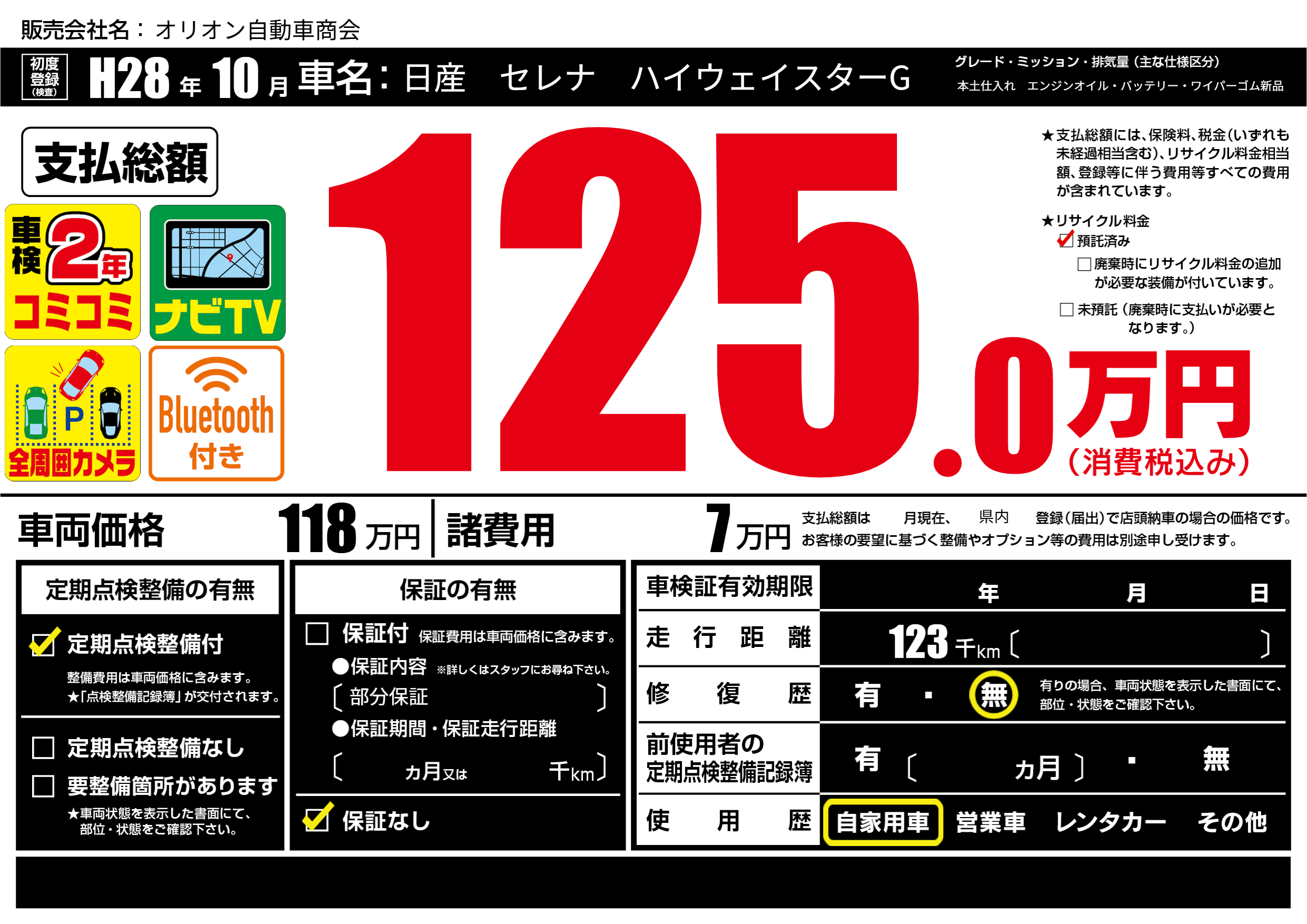 | 走行キロ | 12.3万km | 初年度登録 | H28年10月 |