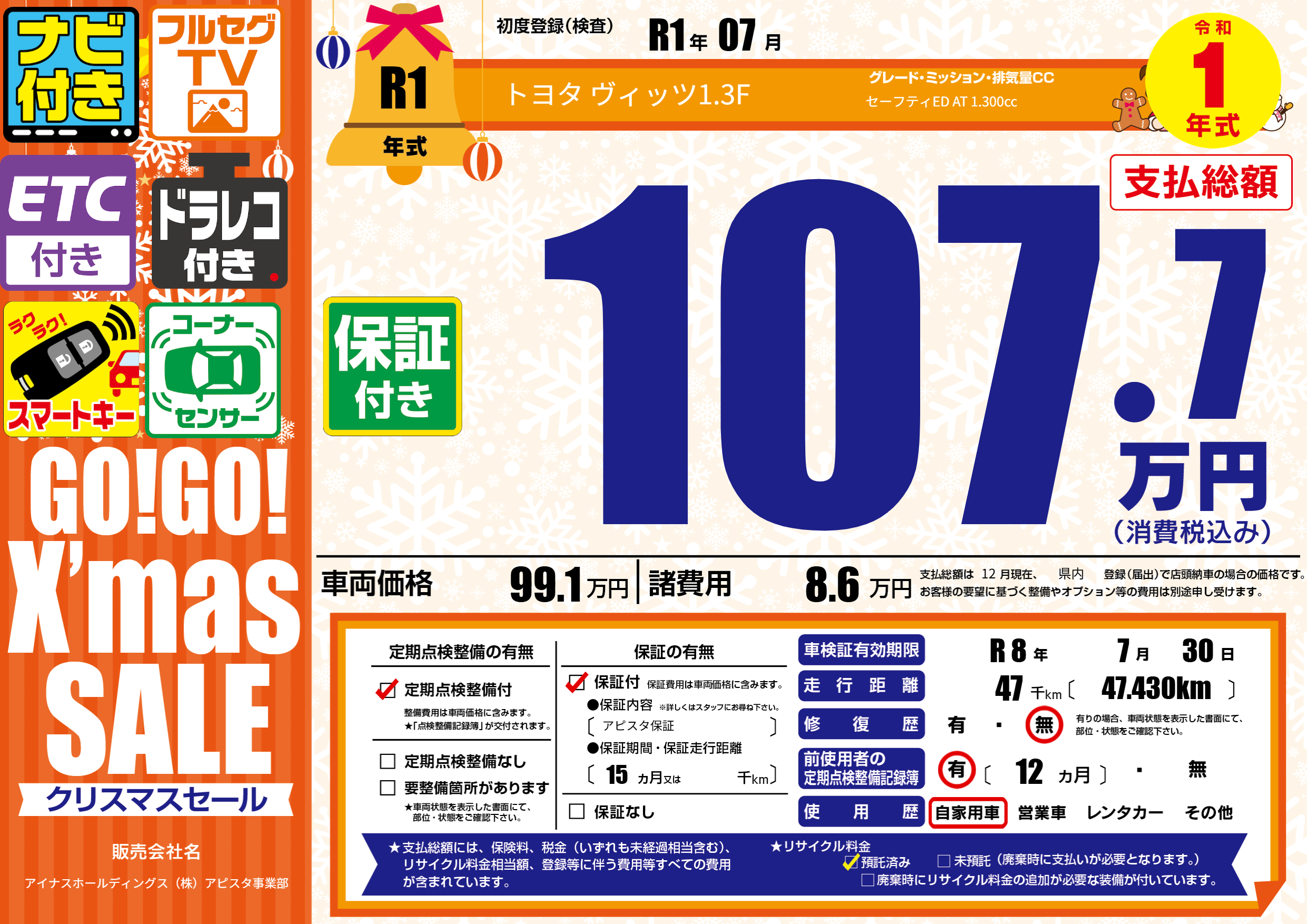 | 車名 | トヨタ ヴィッツ1.3F | グレード ミッション 排気量 |