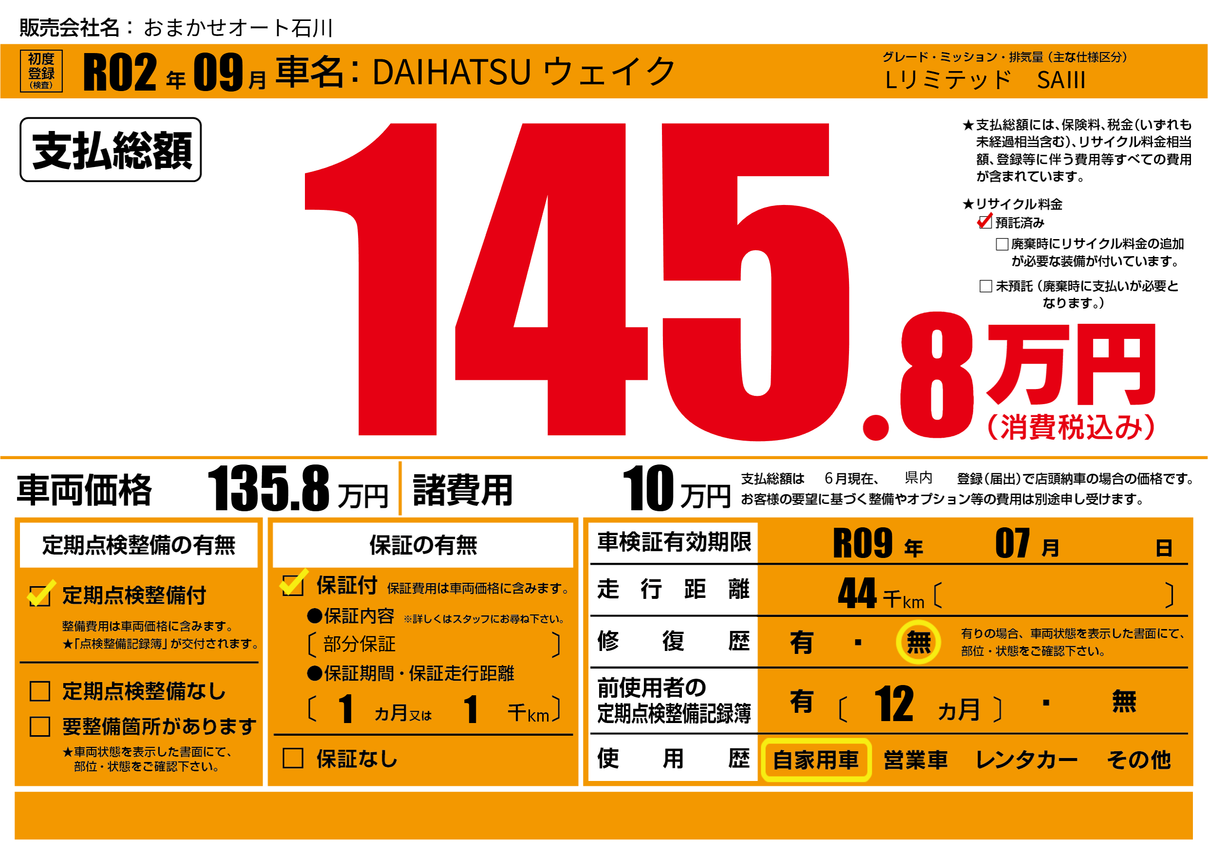 | 車名 | DAIHATSU ウェイク | グレード ミッション 排気量 |
