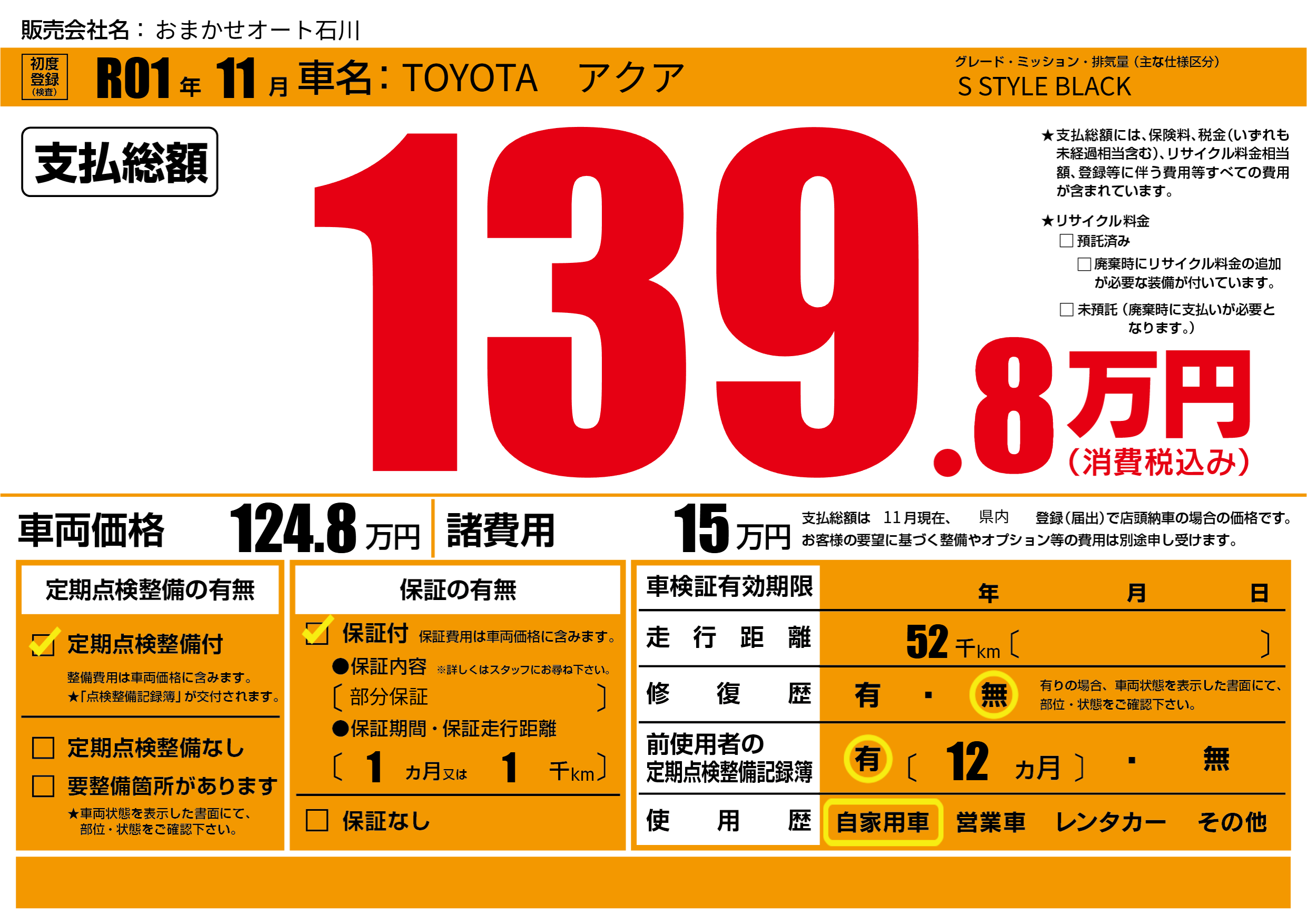 | 車名 | TOYOTA アクア | グレード ミッション 排気量 |