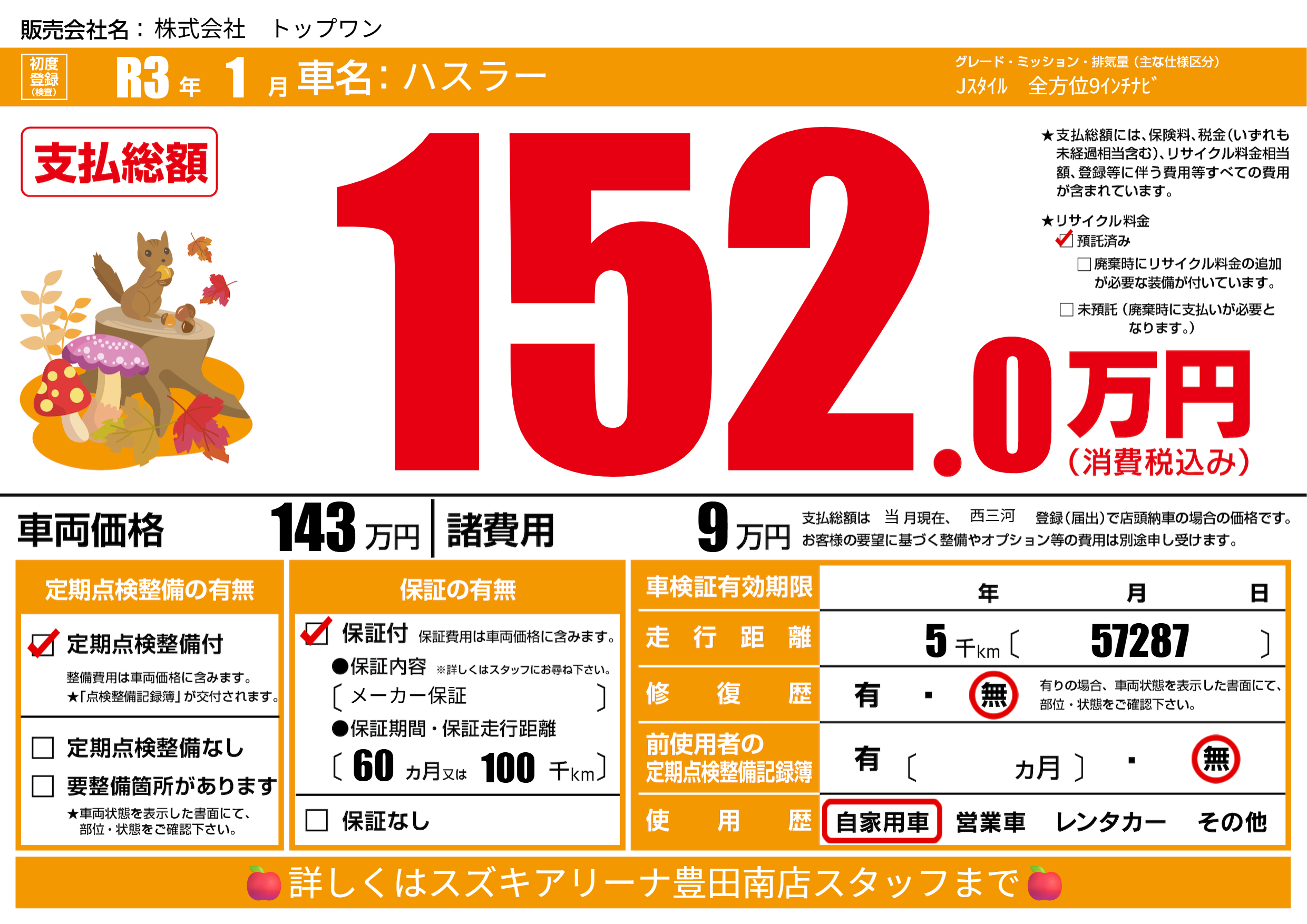 | 走行キロ | 0.5万km | 初年度登録 | R3年1月 |