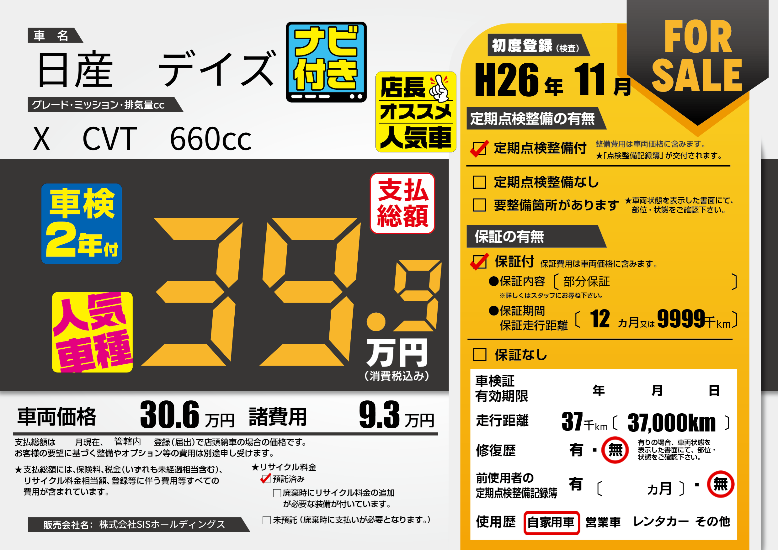 | 走行キロ | 3.7万km | 初年度登録 | H26年11月 |