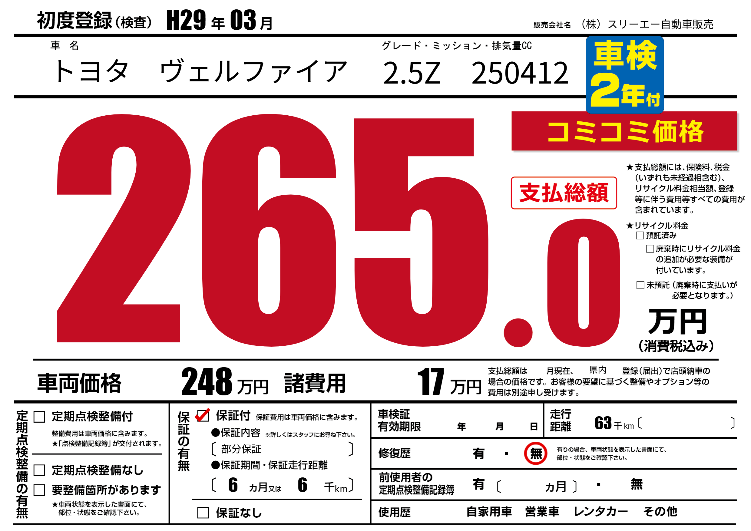 保証付き 保証内容(部分保証) 6ヶ月または(6)千kmまで |