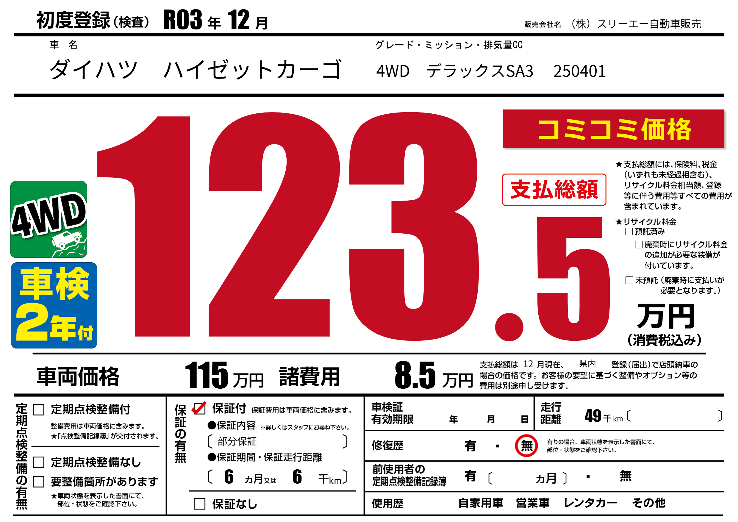 | 走行キロ | 4.9万km | 初年度登録 | R03年12月 |