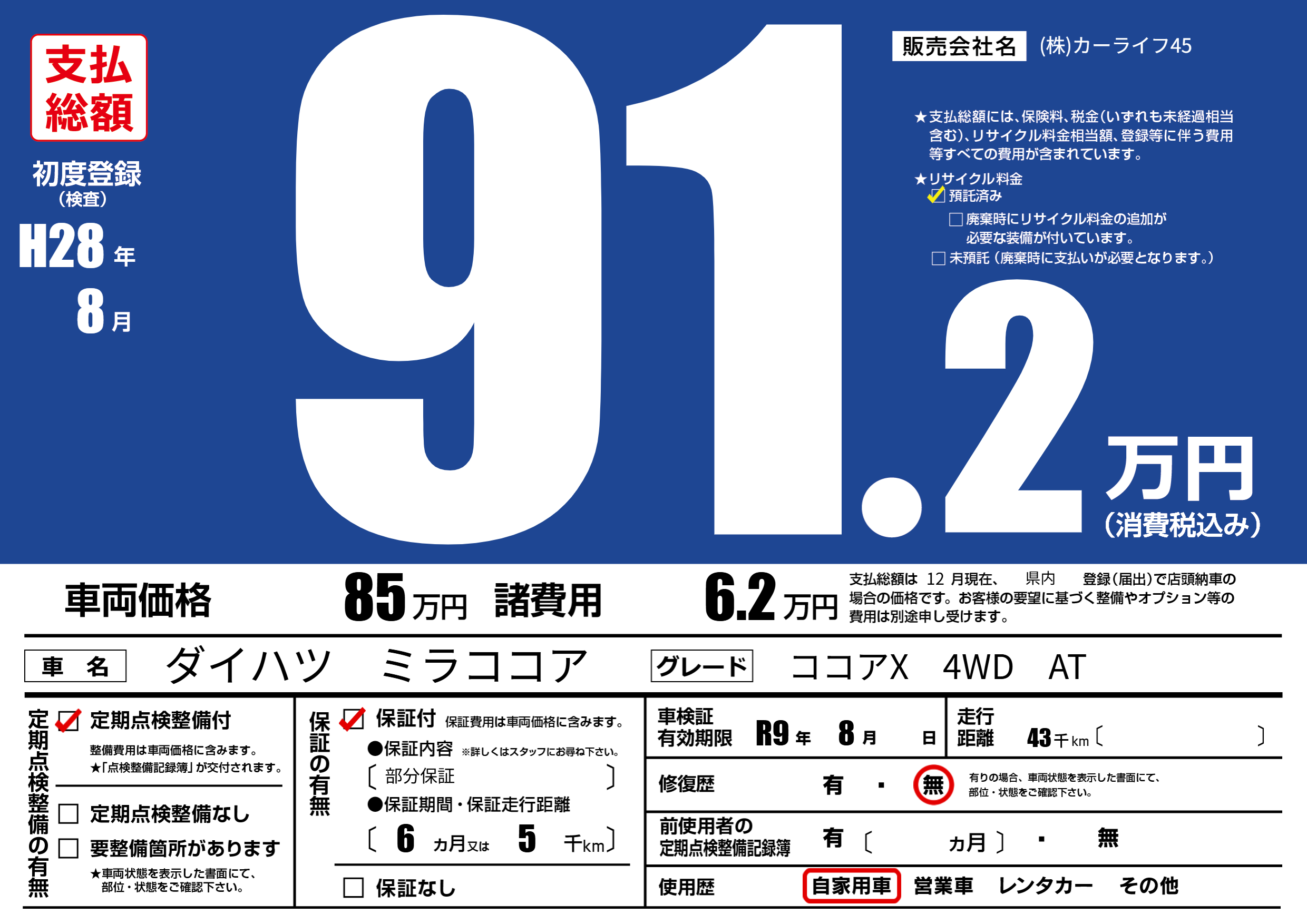| 走行キロ | 4.3万km | 初年度登録 | H28年8月 |