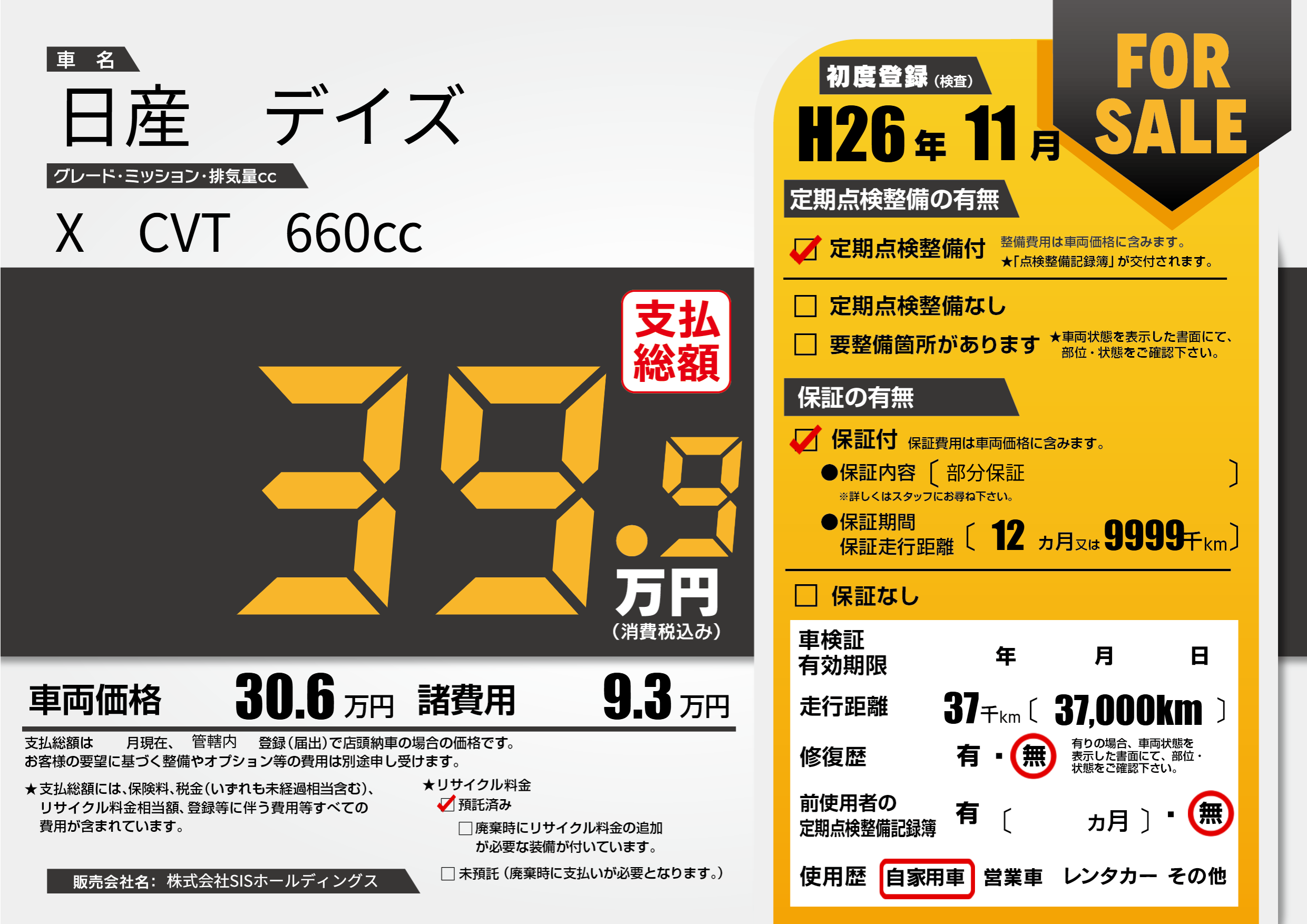 | 車名 | 日産 デイズ | グレード ミッション 排気量 |