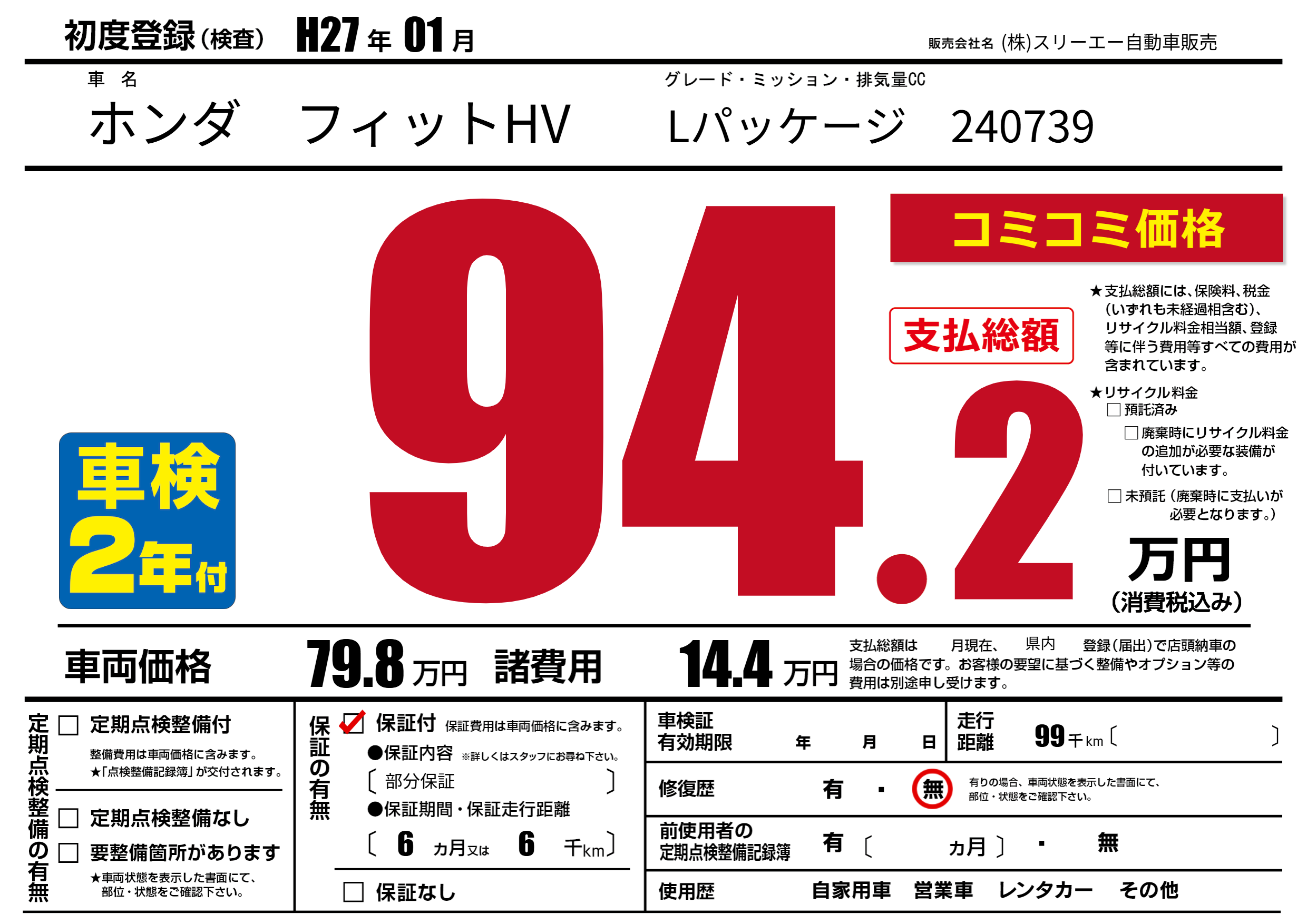| 走行キロ | 9.9万km | 初年度登録 | H27年01月 |