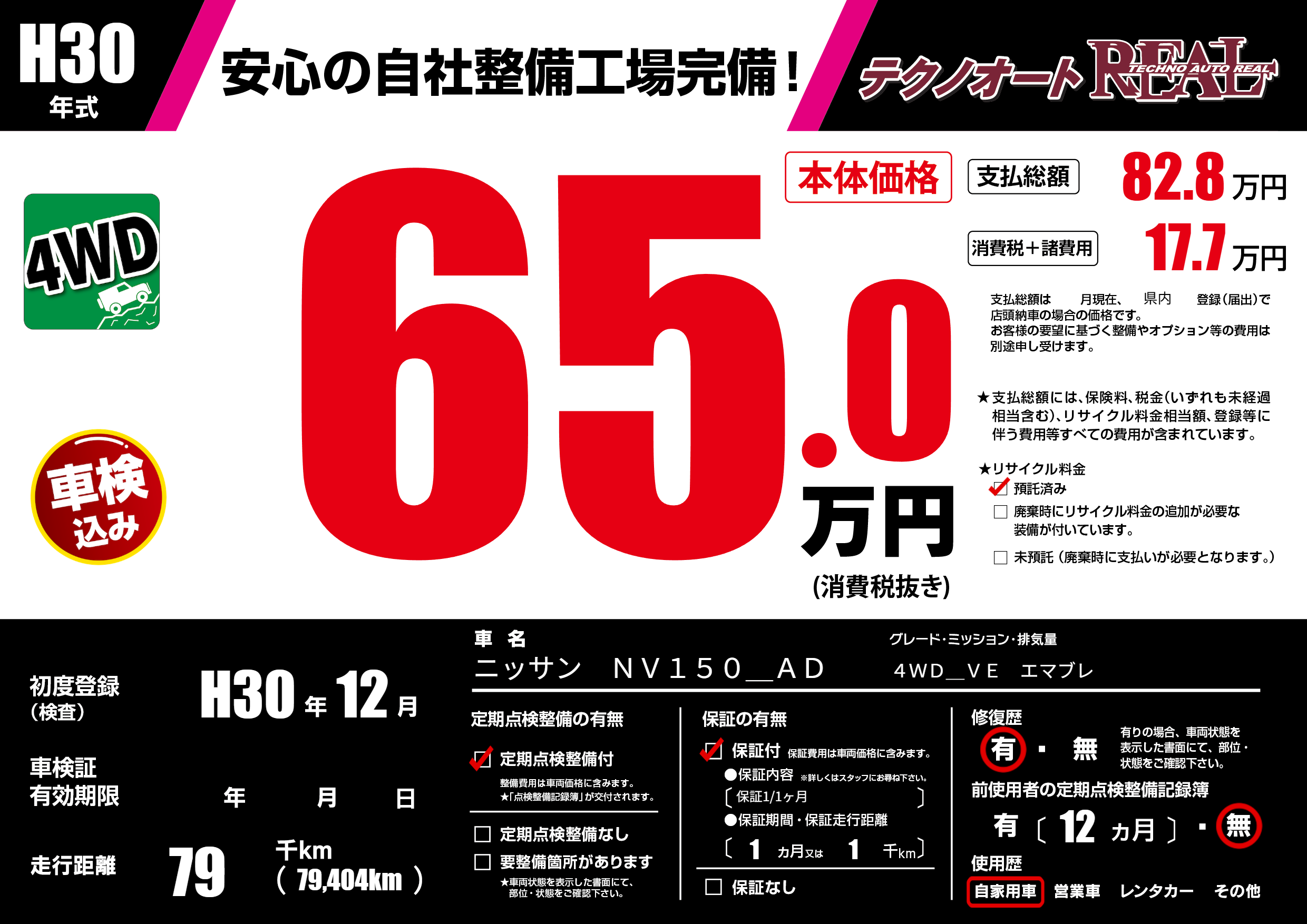 | 走行キロ | 7.9万km | 初年度登録 | H30年12月 |