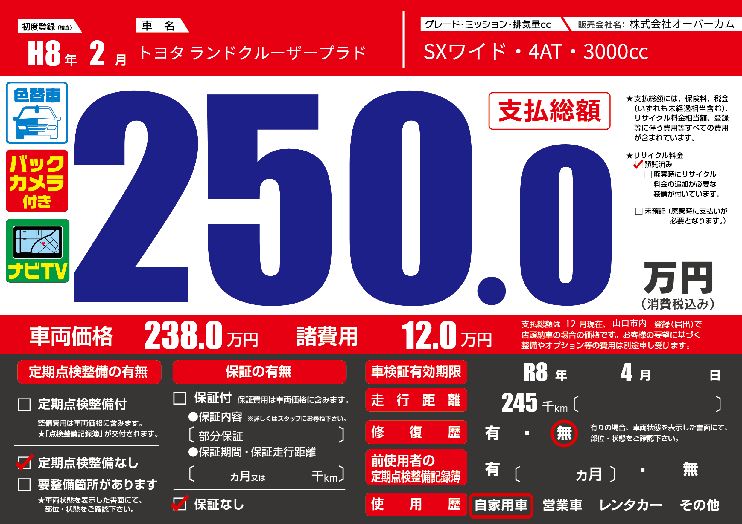 | 車名 | トヨタ ランドクルーザープラド | グレード ミッション 排気量 |
