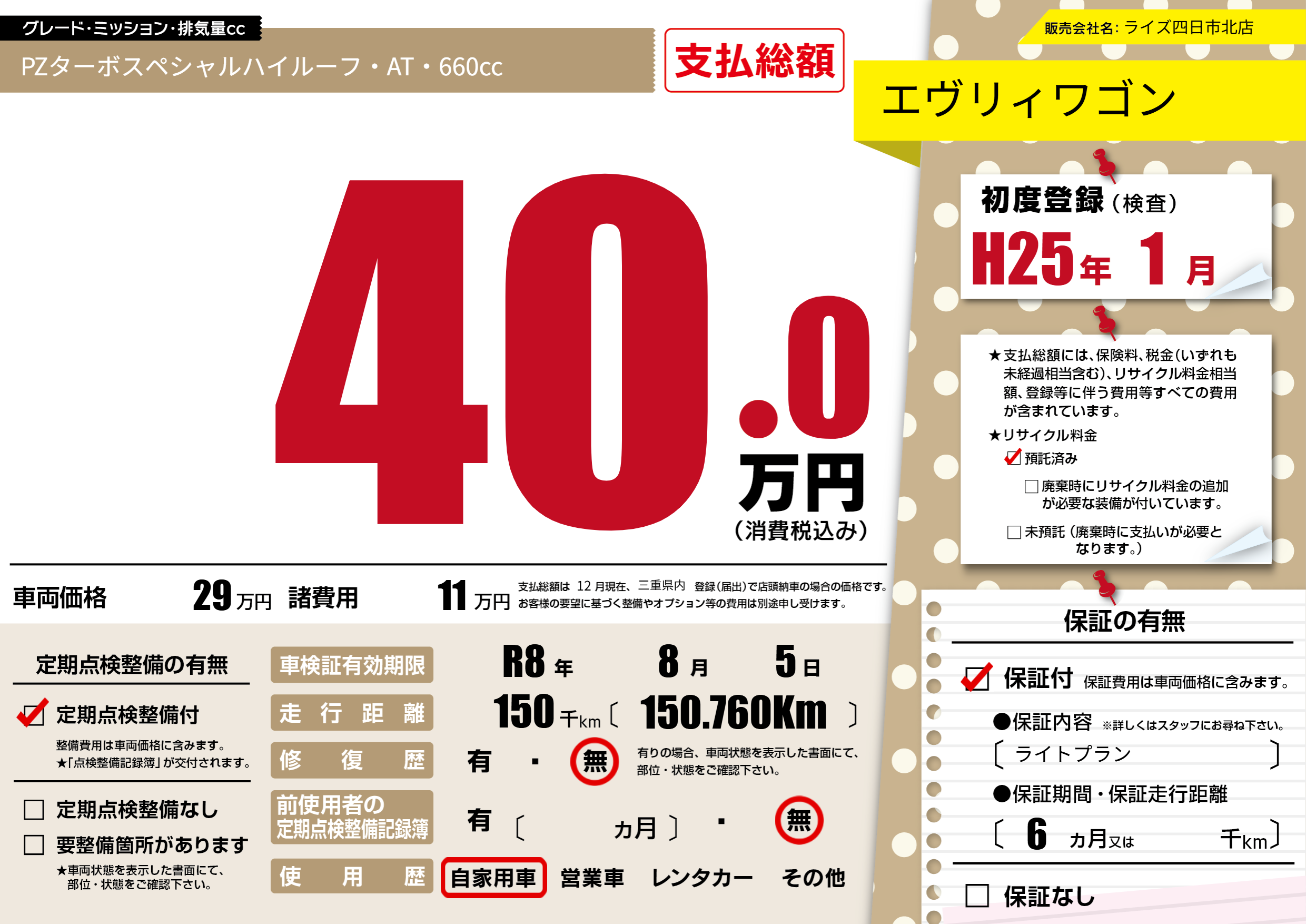 | 車名 | エヴリィワゴン | グレード ミッション 排気量 |
