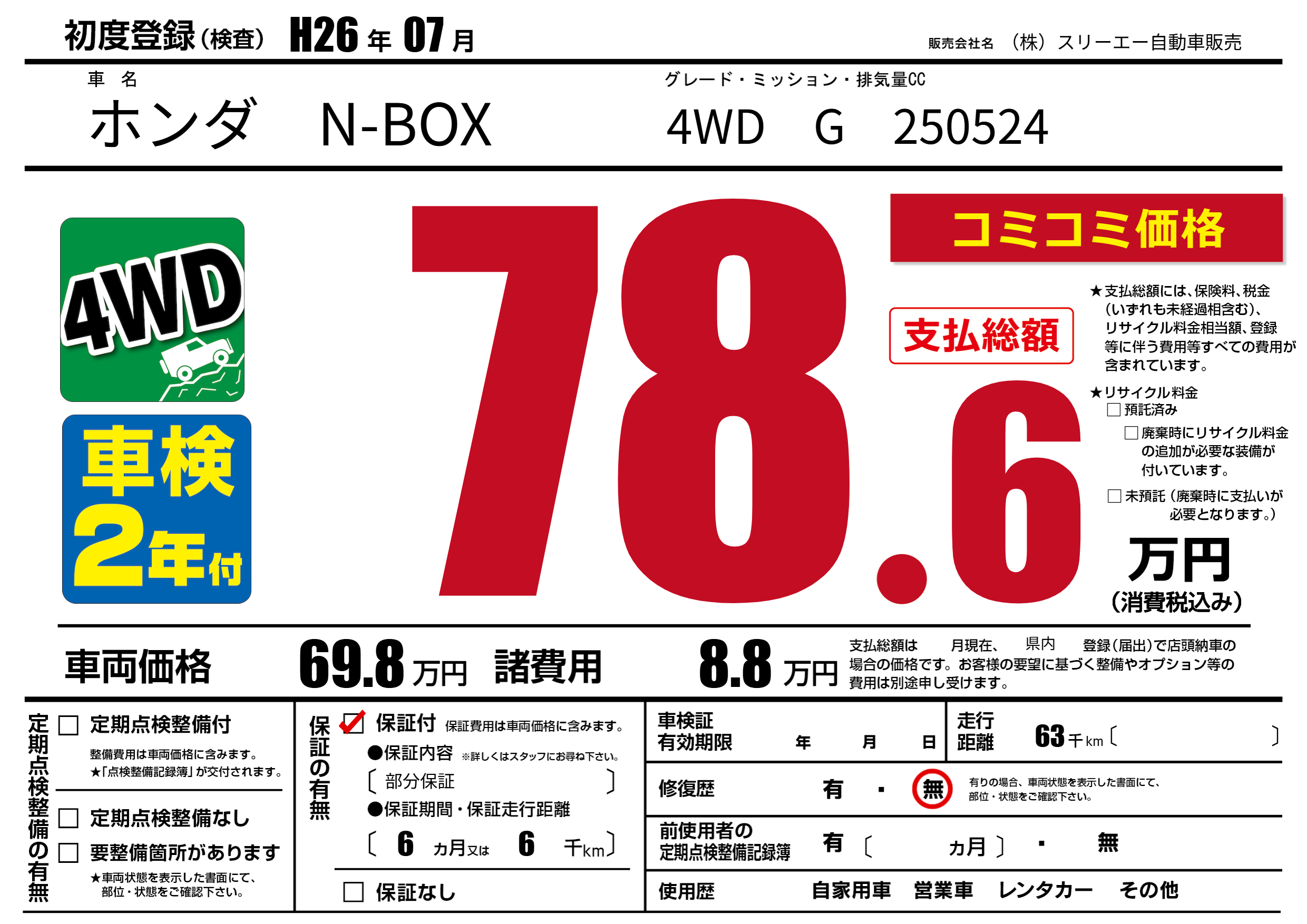 | 車名 | ホンダ N-BOX | グレード ミッション 排気量 |