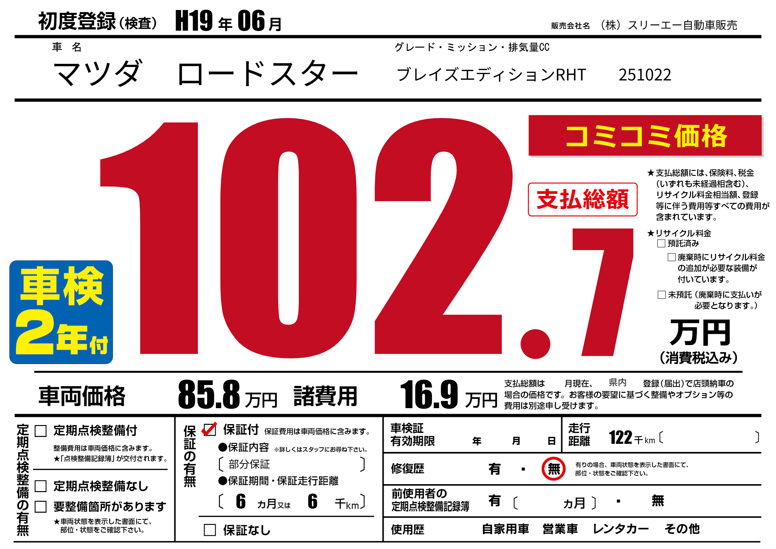 保証付き 保証内容(部分保証) 6ヶ月または(6)千kmまで |