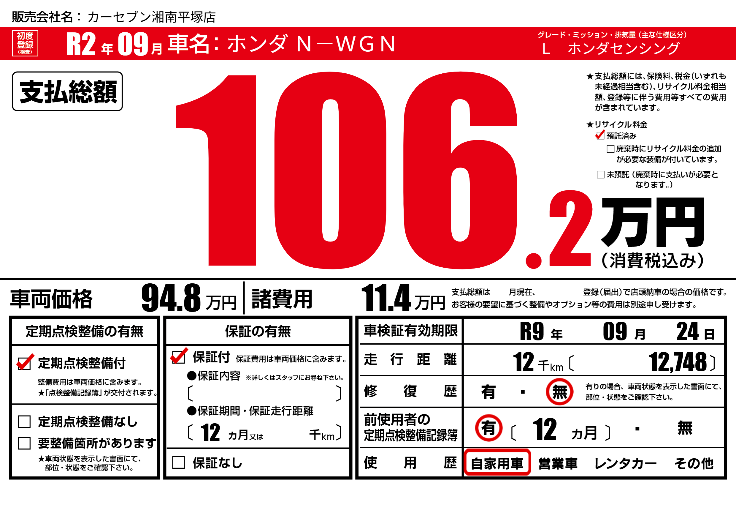| 走行キロ | 1.2万km | 初年度登録 | R2年09月 |