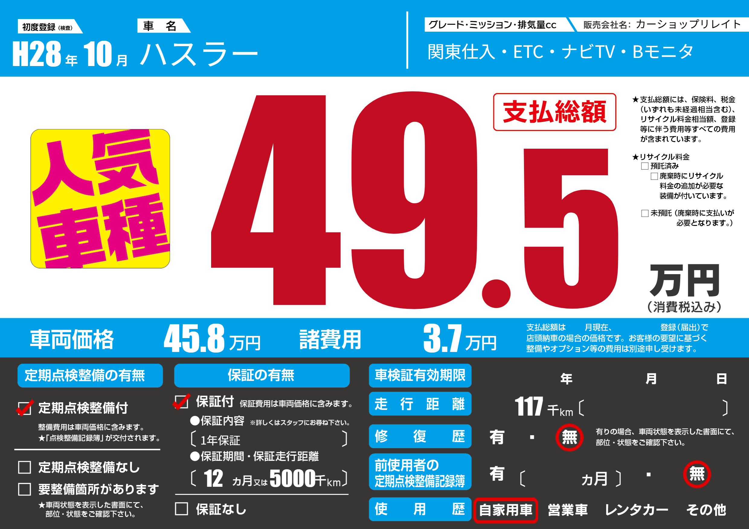 保証付き 保証内容(1年保証) 12ヶ月または(5000)千kmまで |