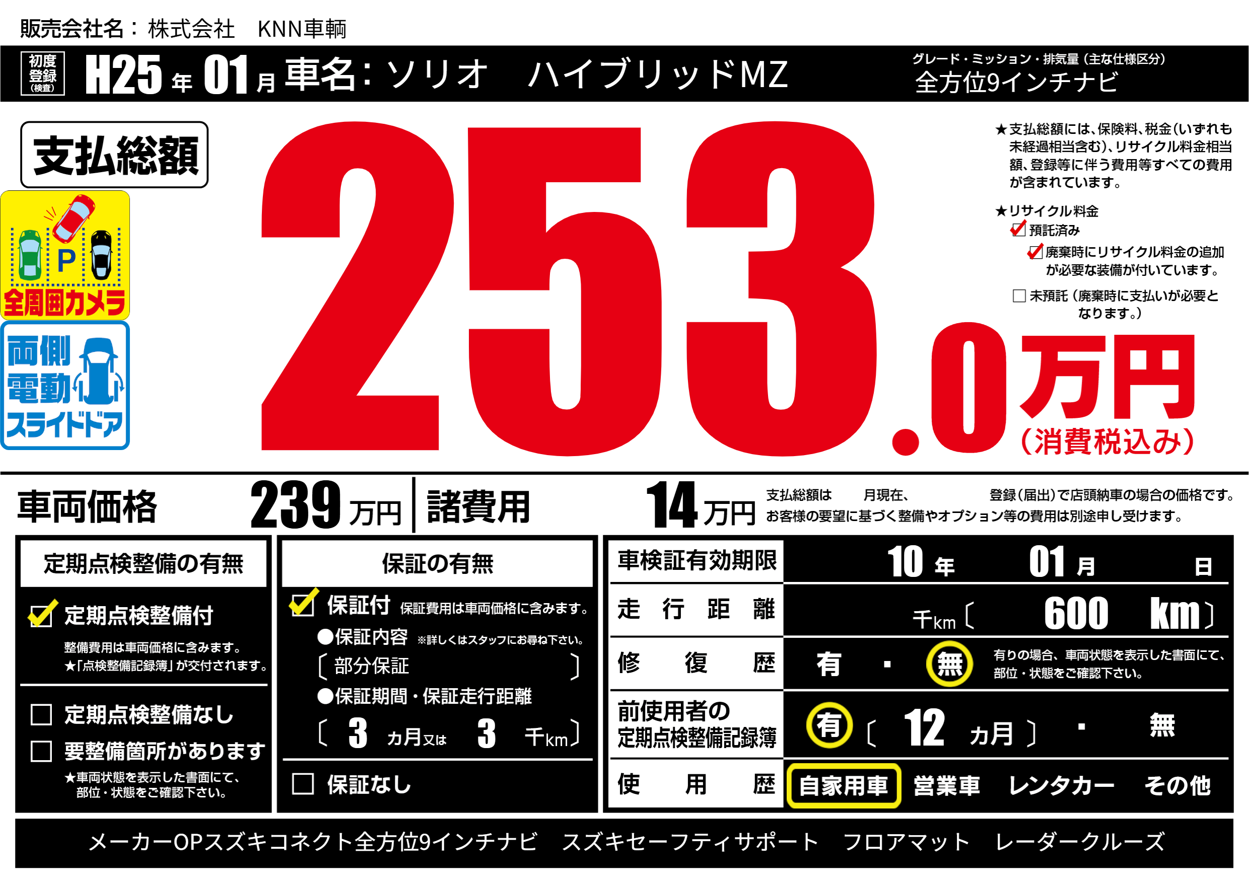 | 走行キロ | - | 初年度登録 | H25年01月 |