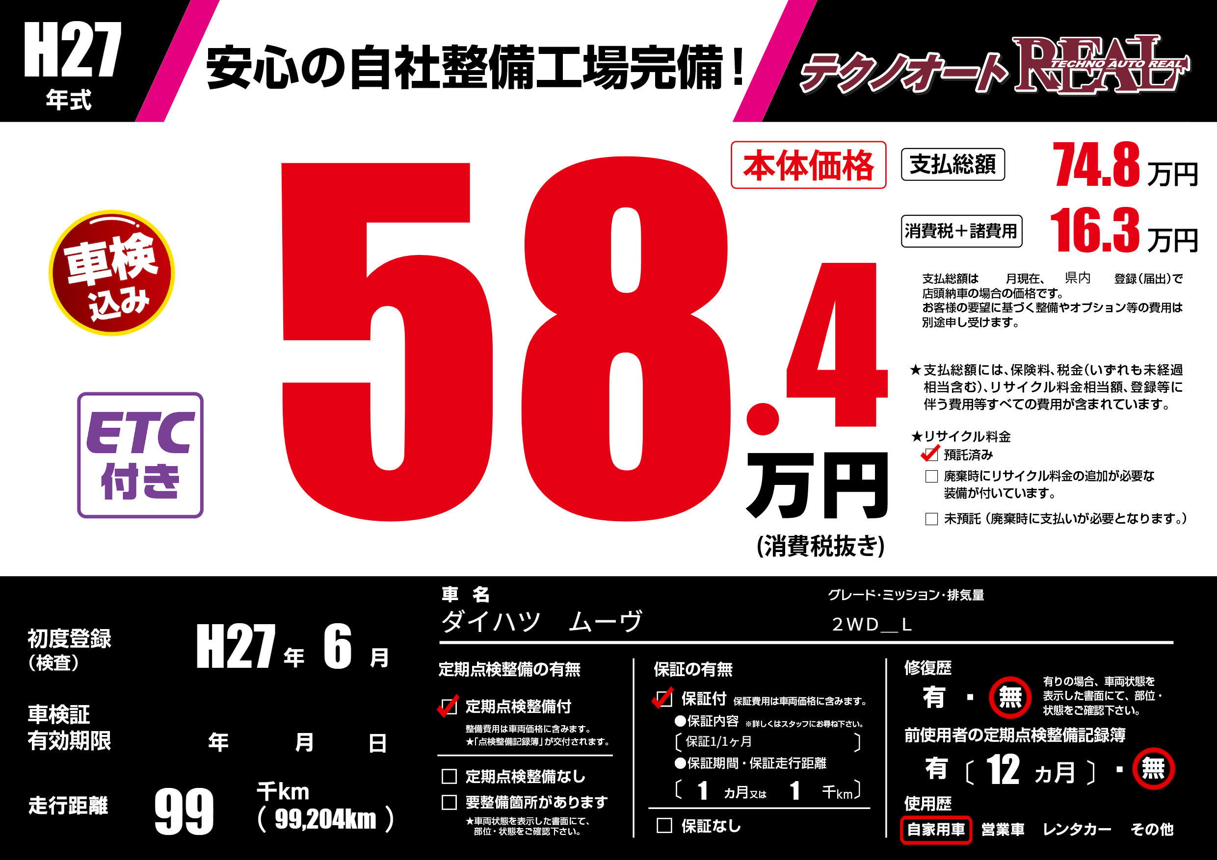 | 走行キロ | 9.9万km | 初年度登録 | H27年6月 |