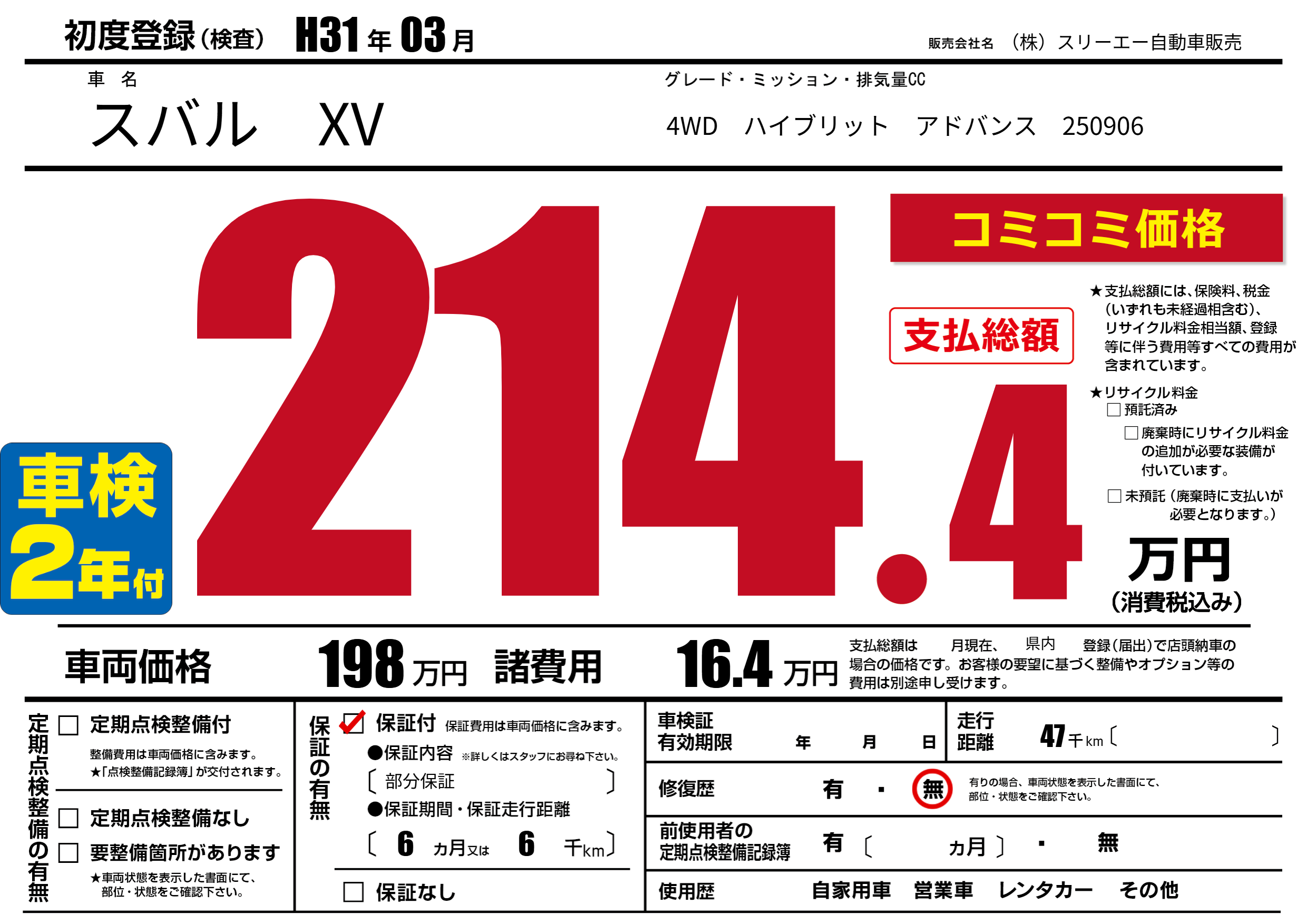 | 車名 | スバル XV | グレード ミッション 排気量 |