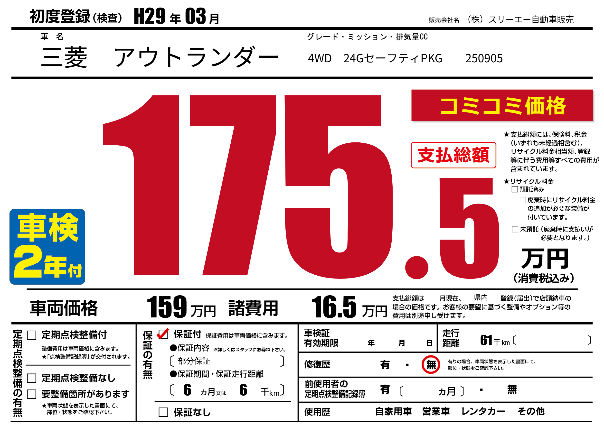保証付き 保証内容(部分保証) 6ヶ月または(6)千kmまで |