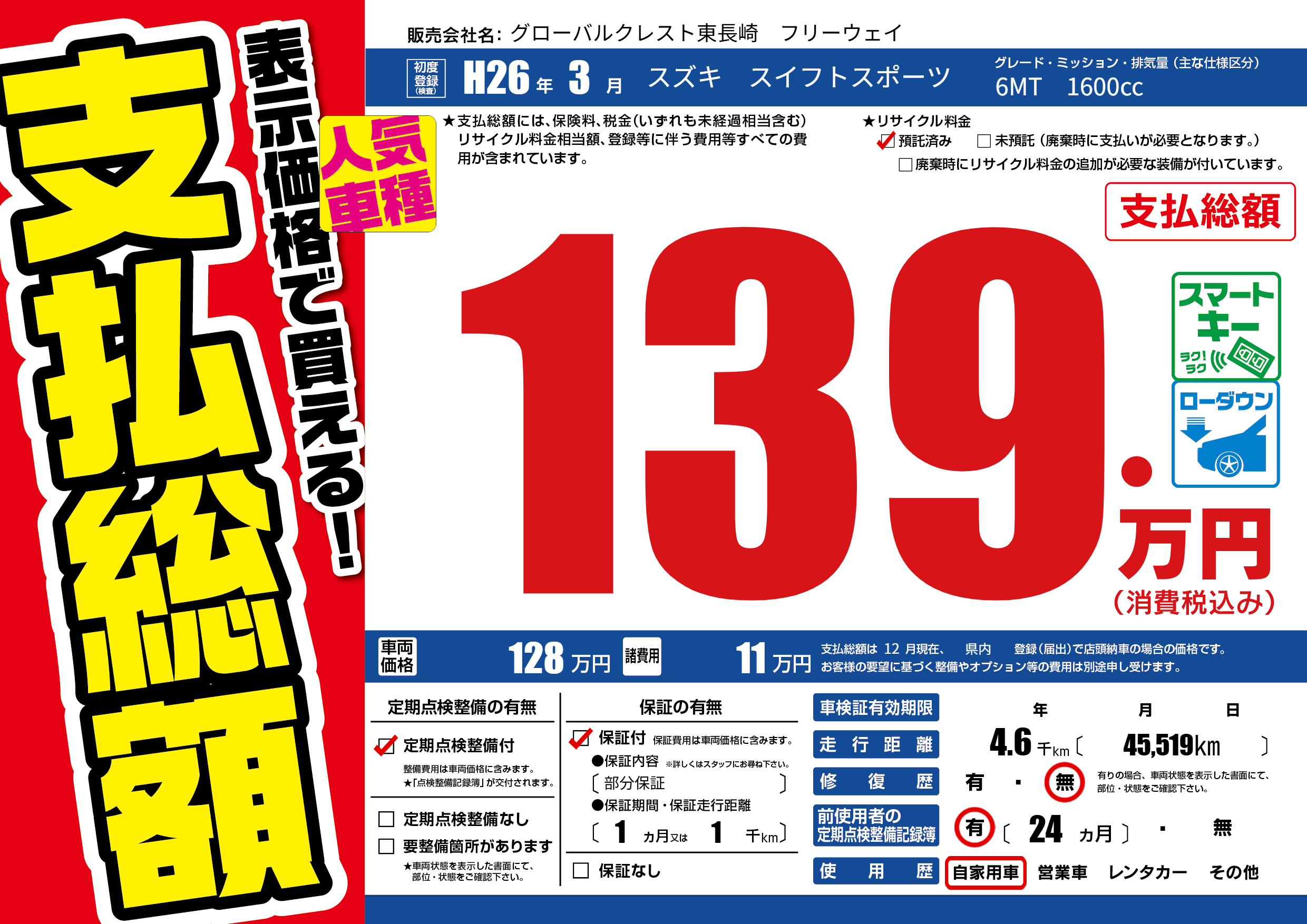 | 車名 | スズキ スイフトスポーツ | グレード ミッション 排気量 |