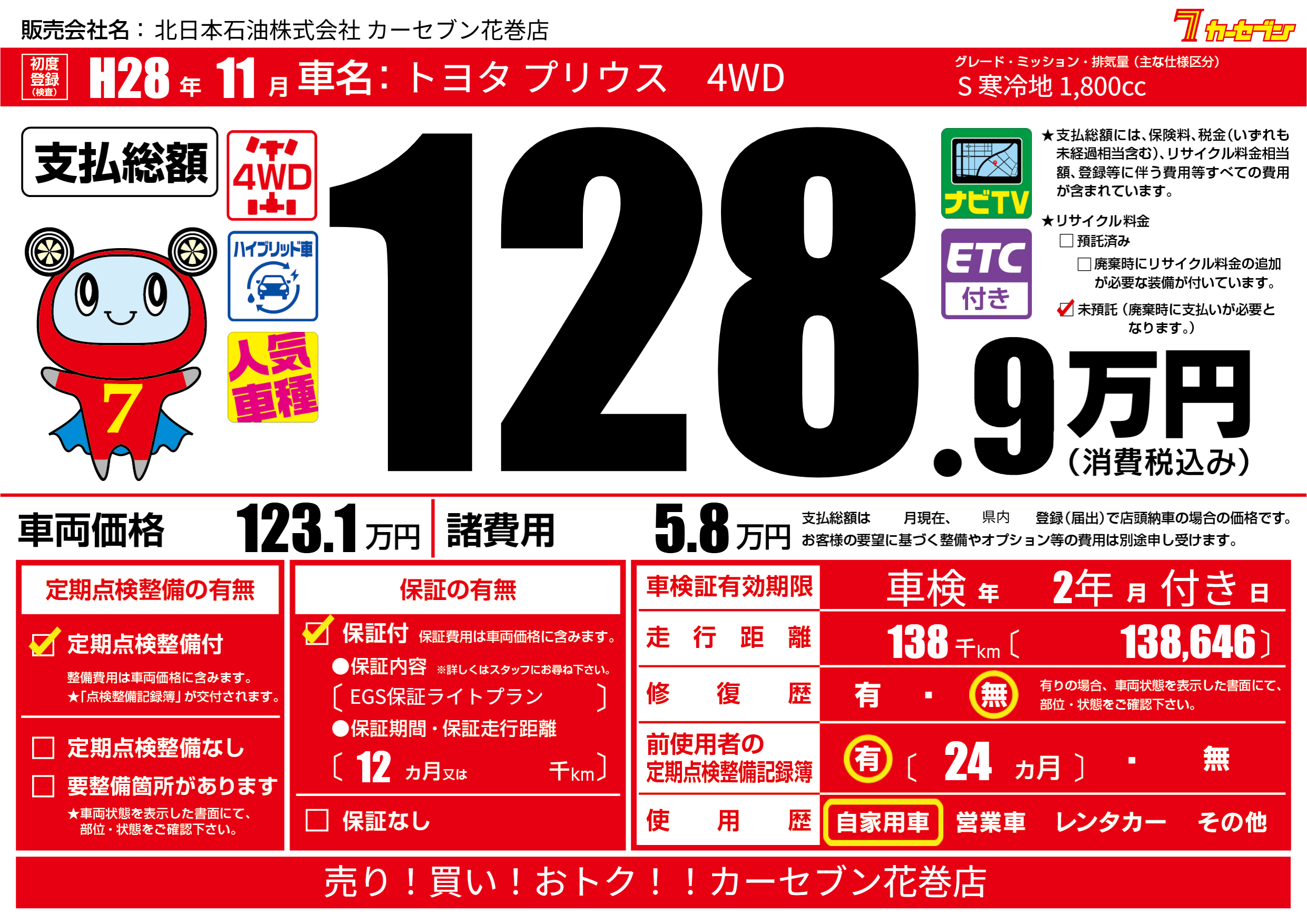 | 走行キロ | 13.8万km | 初年度登録 | H28年11月 |