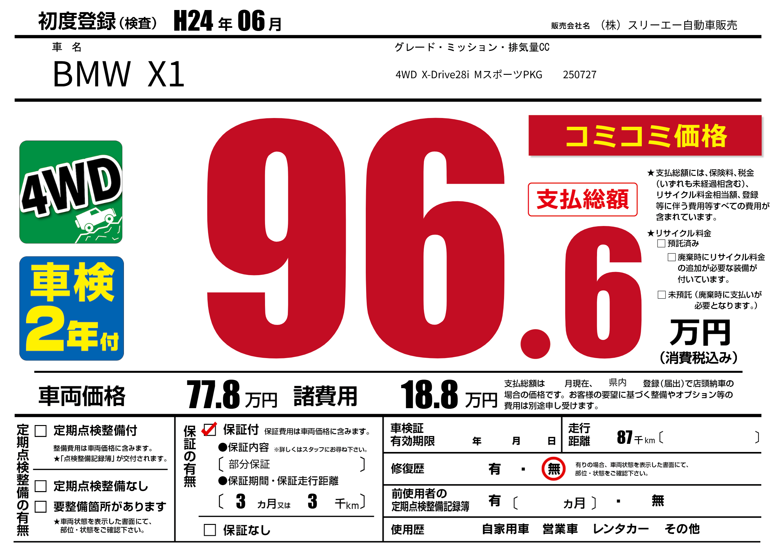 | 車名 | BMW X1 | グレード ミッション 排気量 |