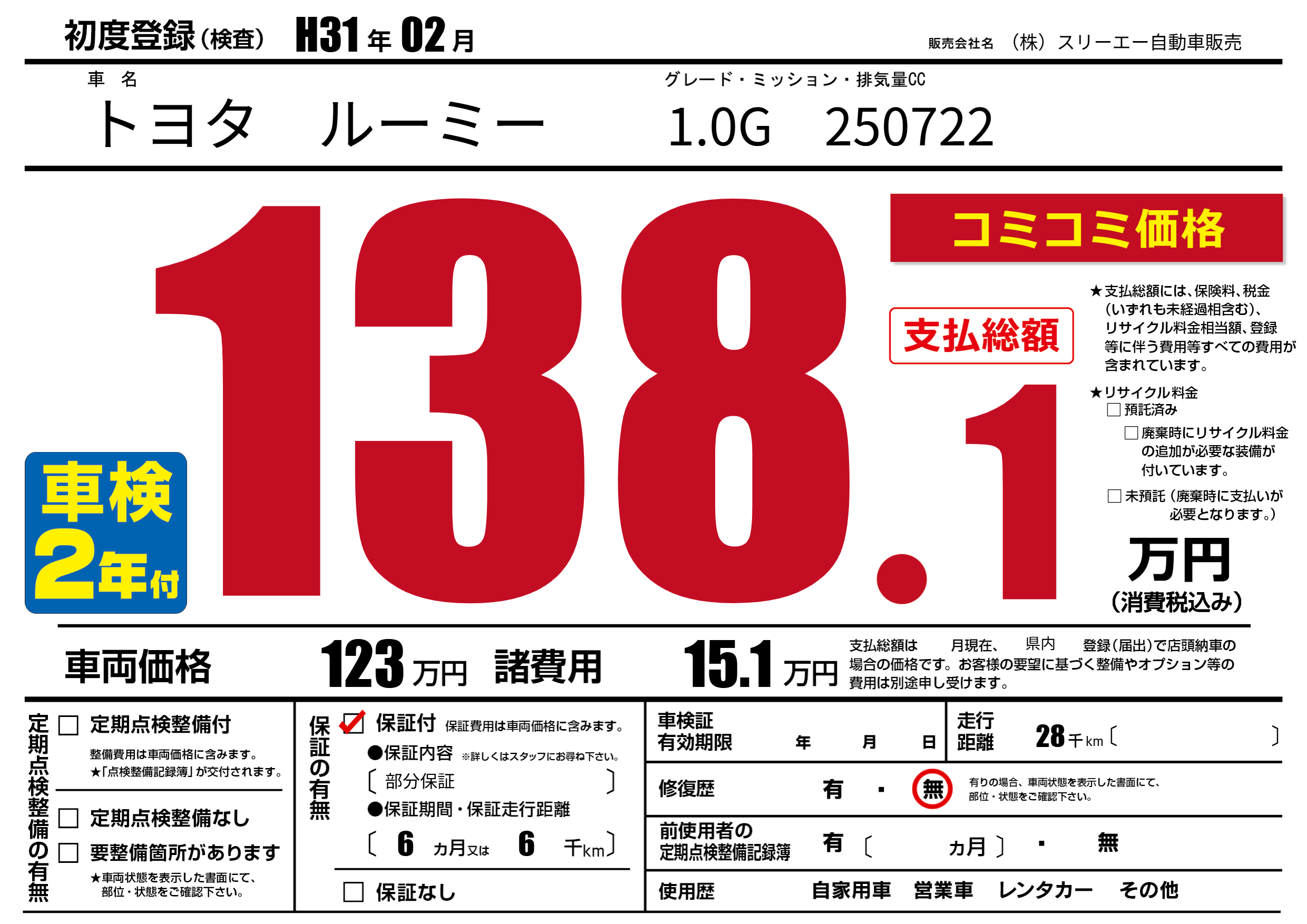 保証付き 保証内容(部分保証) 6ヶ月または(6)千kmまで |