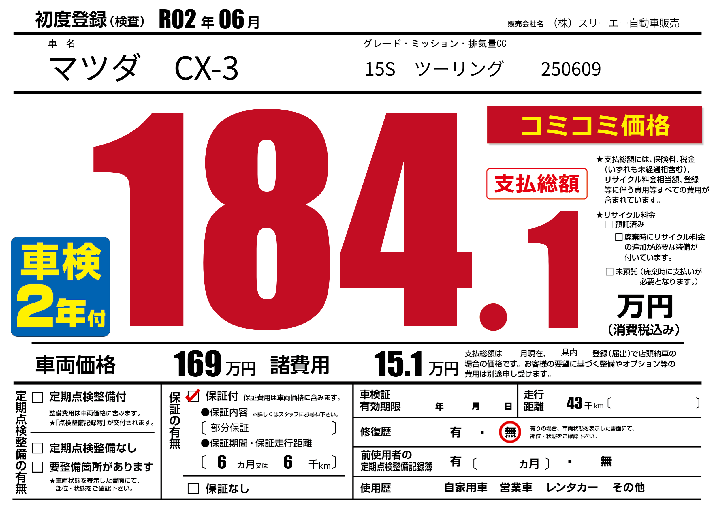 保証付き 保証内容(部分保証) 6ヶ月または(6)千kmまで |