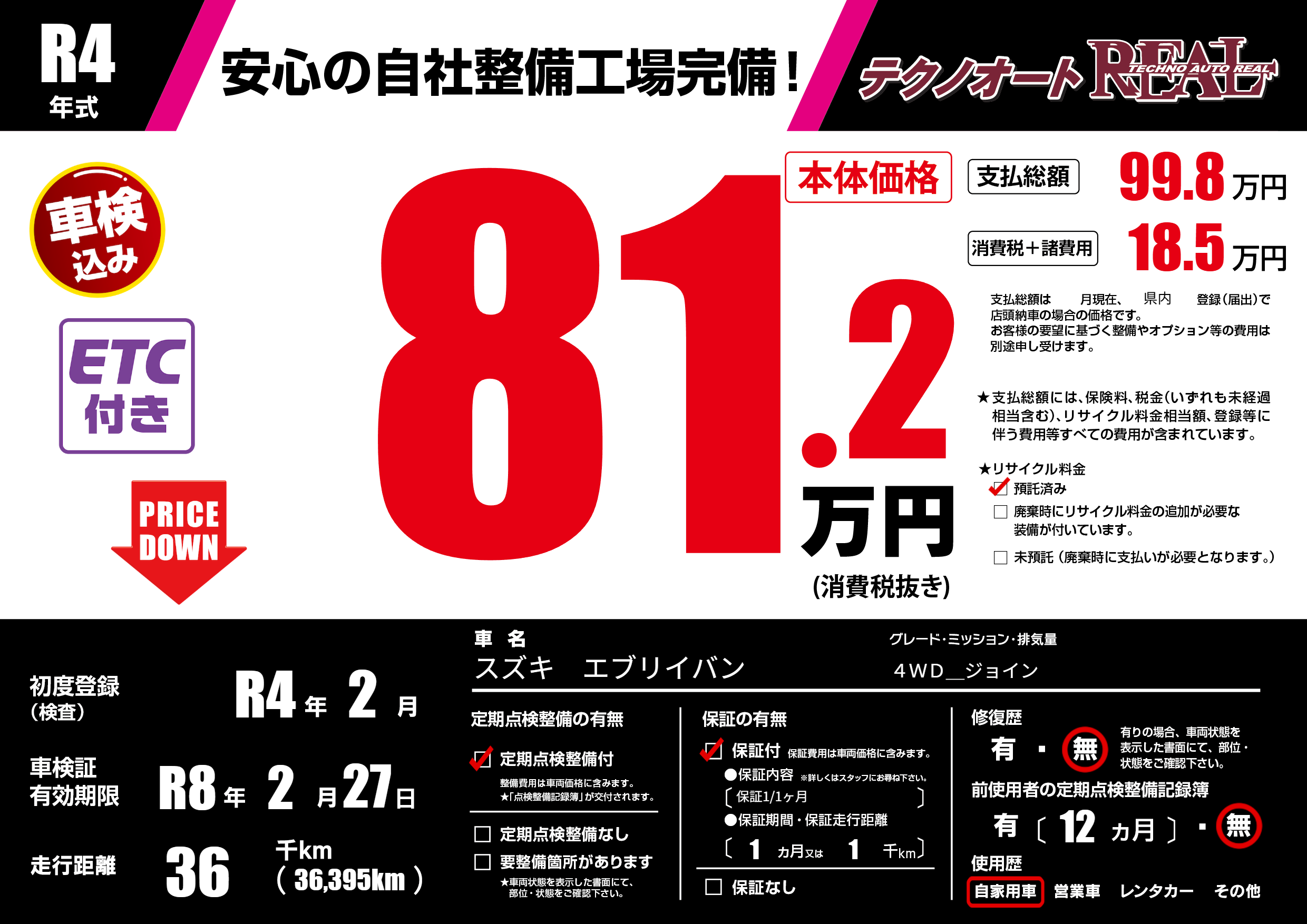 | 車名 | スズキ エブリイバン | グレード ミッション 排気量 |