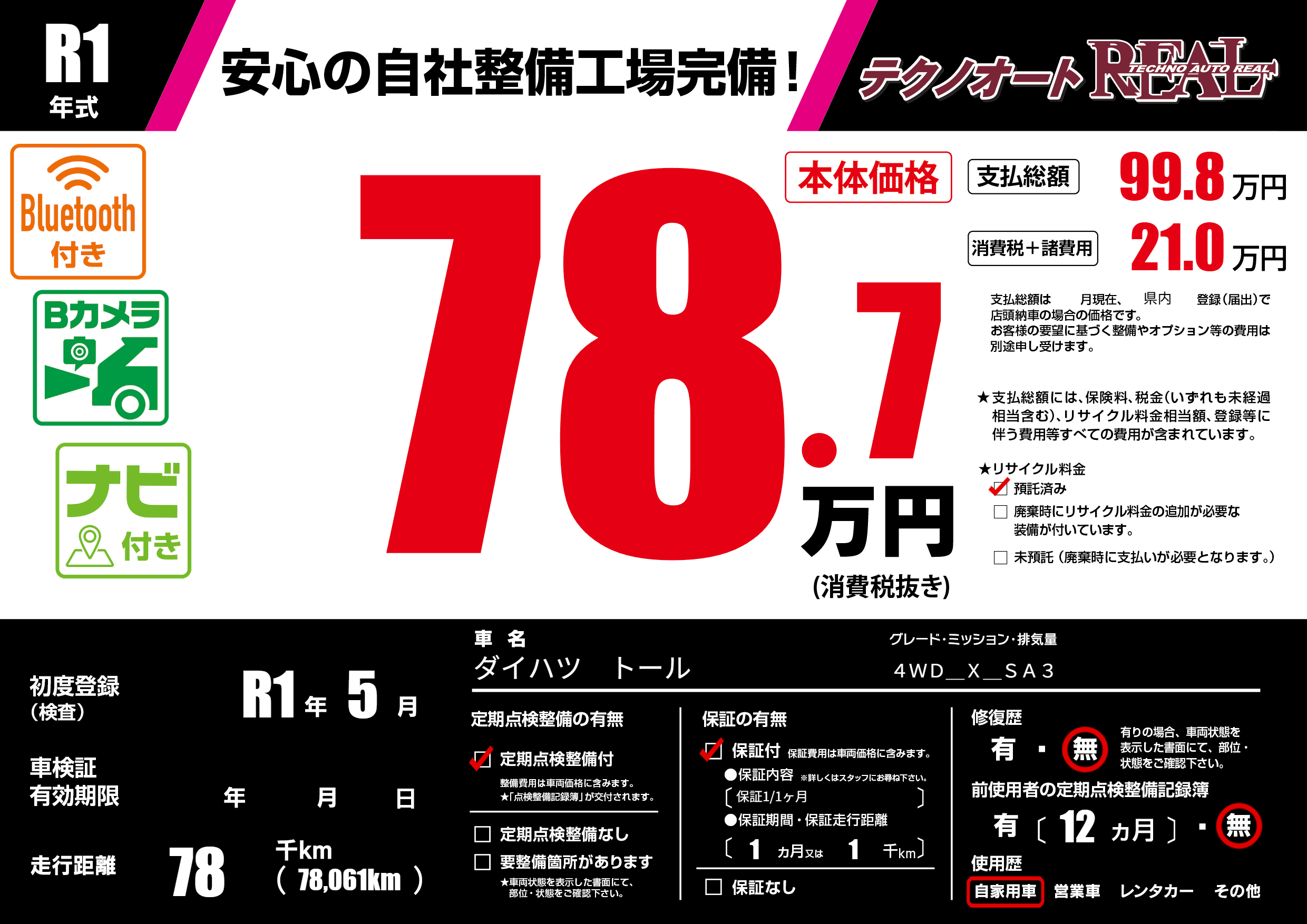 | 走行キロ | 7.8万km | 初年度登録 | R1年5月 |