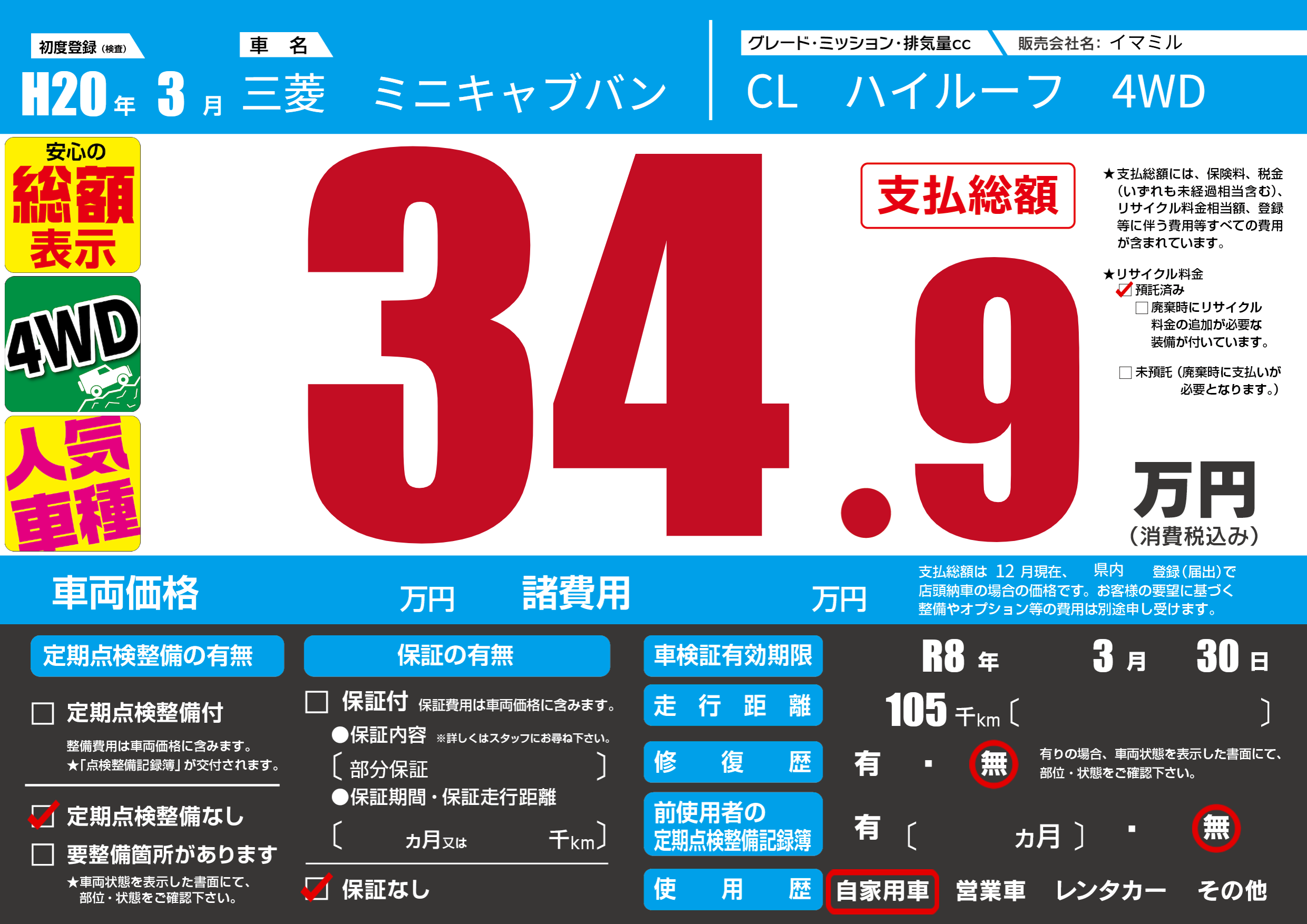 | 走行キロ | 10.5万km | 初年度登録 | H20年3月 |