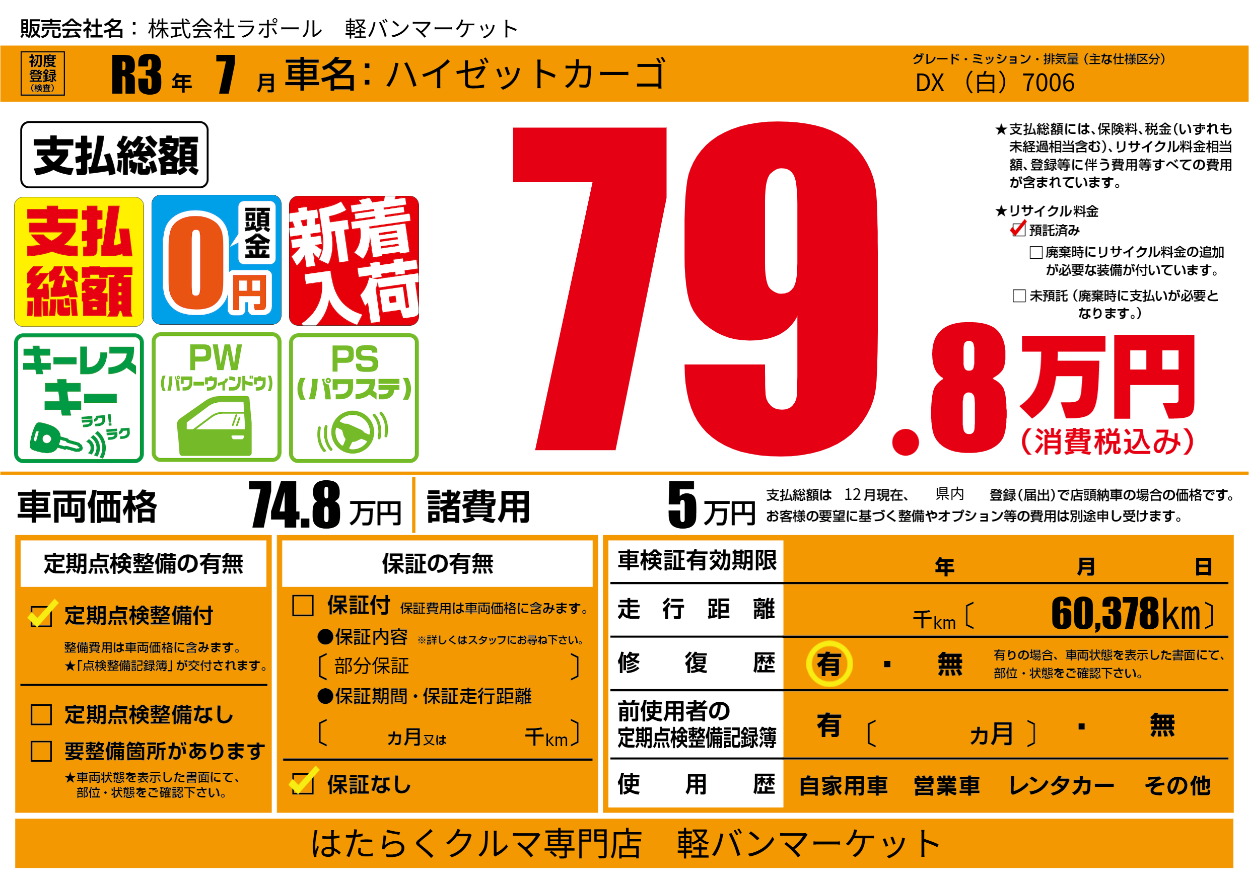 保証なし 保証内容(部分保証) ---ヶ月または()千kmまで |