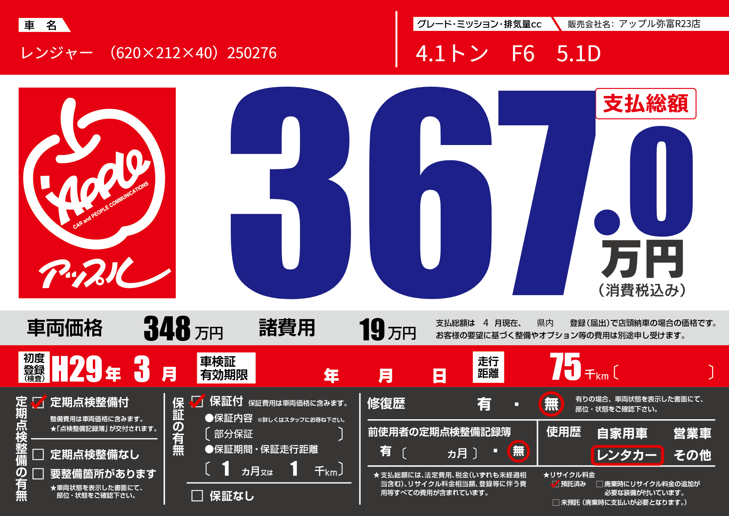 | 車名 | レンジャー (620×212×40)250276 | グレード ミッション 排気量 |
