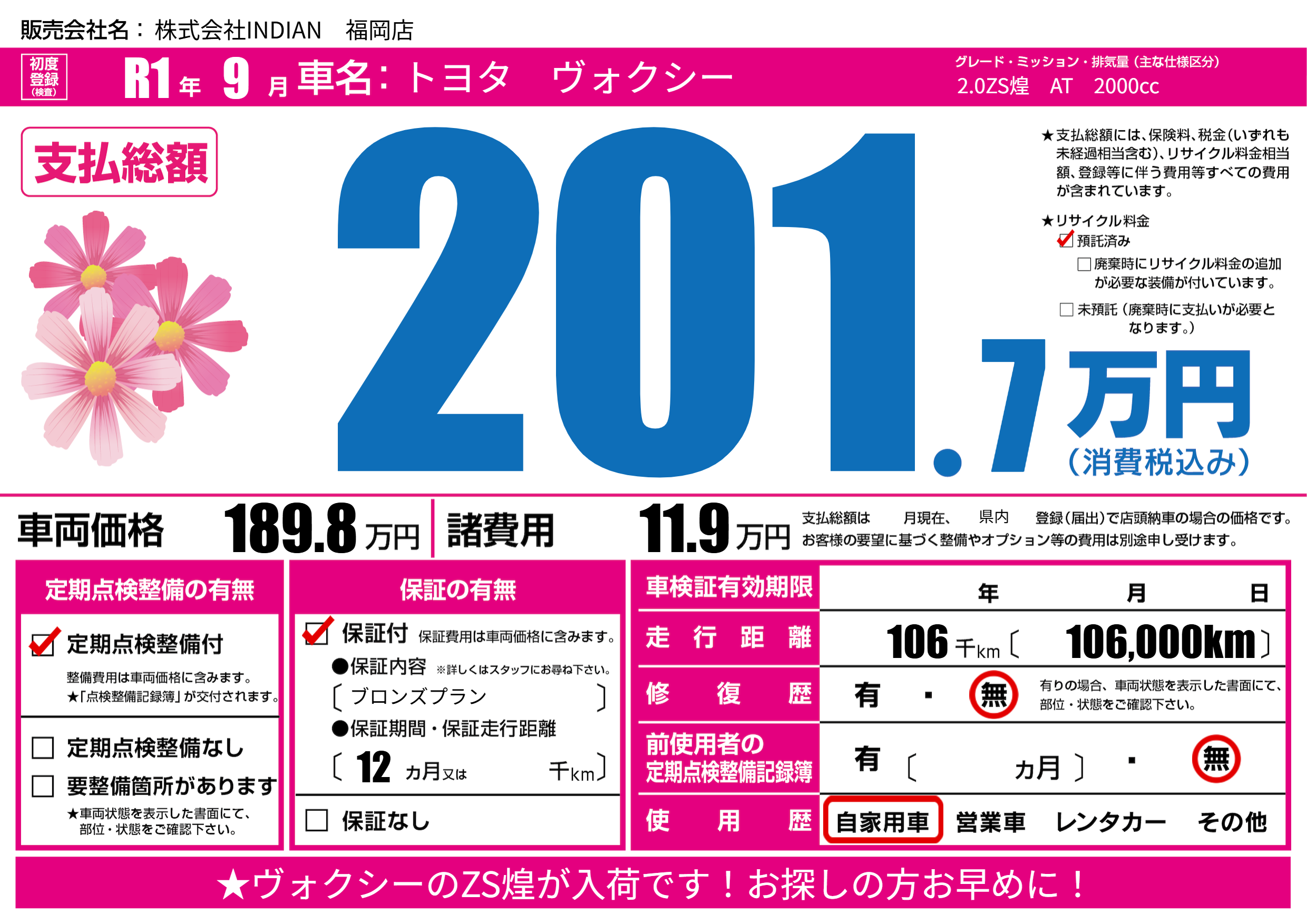 | 走行キロ | 10.6万km | 初年度登録 | R1年9月 |