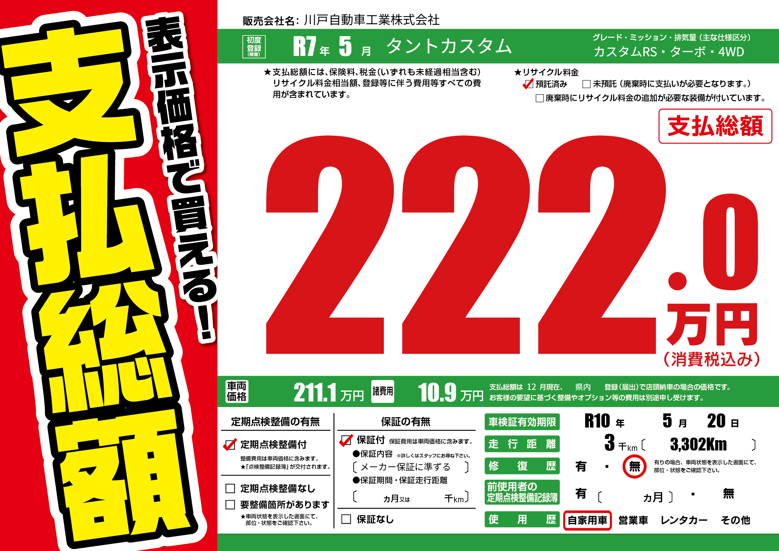 保証付き 保証内容(メーカー保証に準ずる) ---ヶ月または()千kmまで |