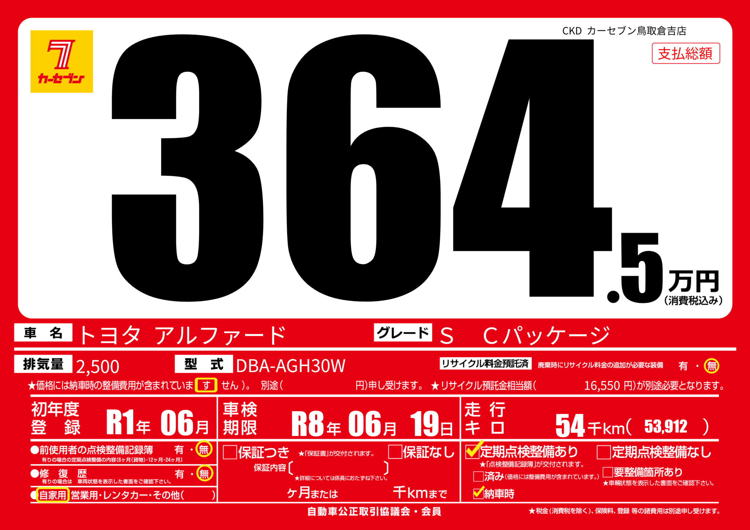 | 車検制限 | R8年 06月 19日 | ||