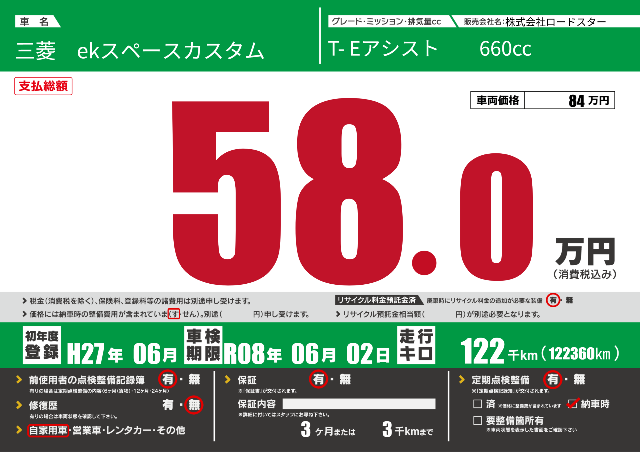 | 定期点検整備 | 定期点検整備あり 納車時あり | ||
