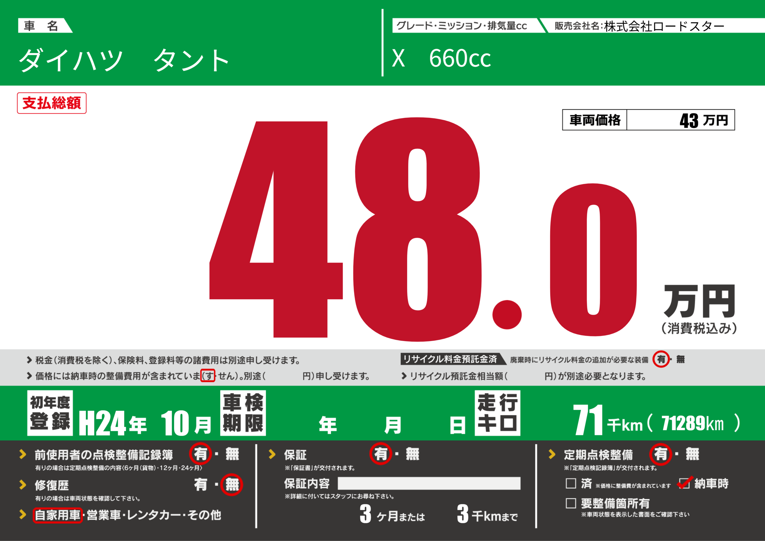 | 車名 | ダイハツ タント | グレード ミッション 排気量 |
