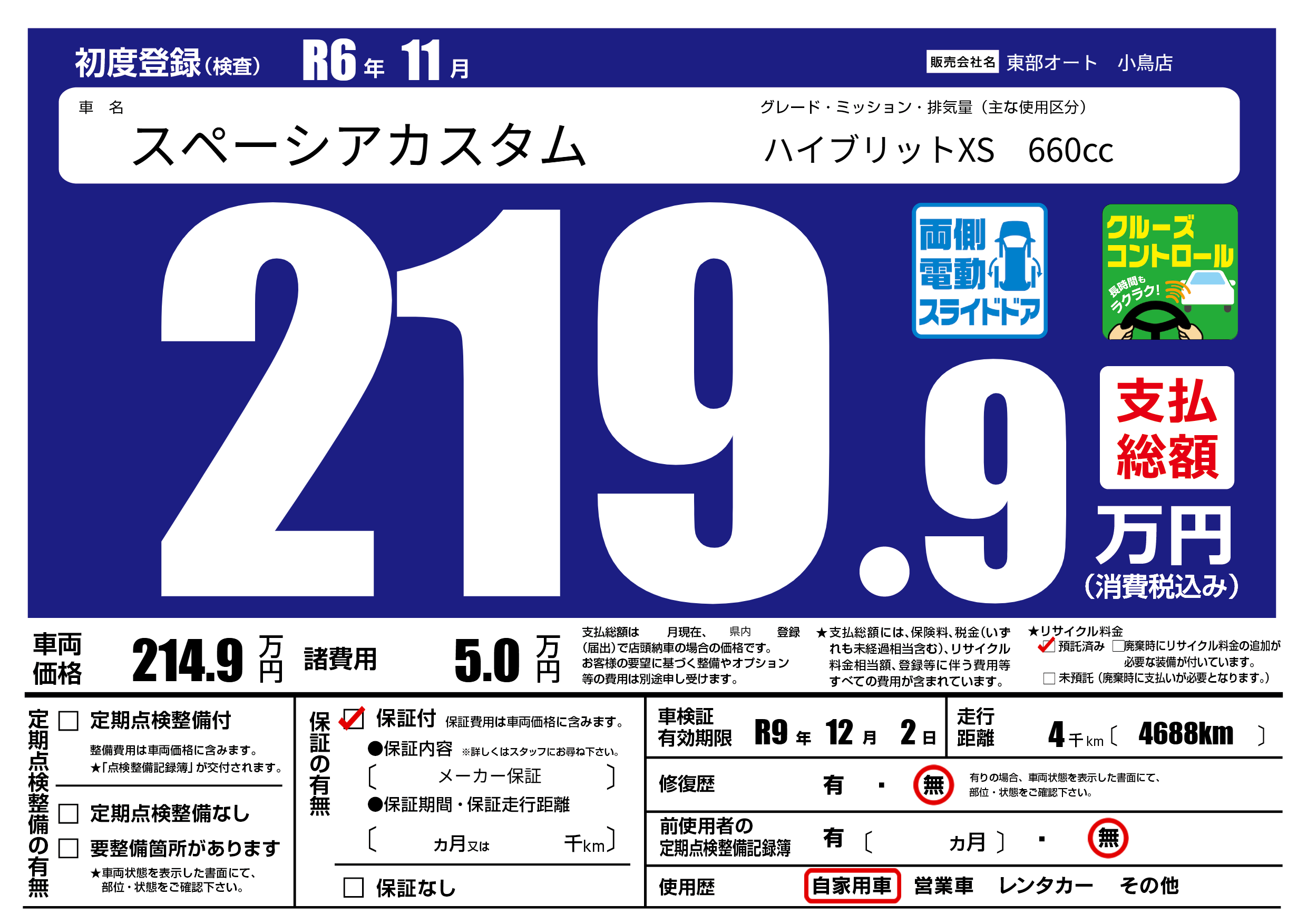 | 車名 | スペーシアカスタム | グレード ミッション 排気量 |