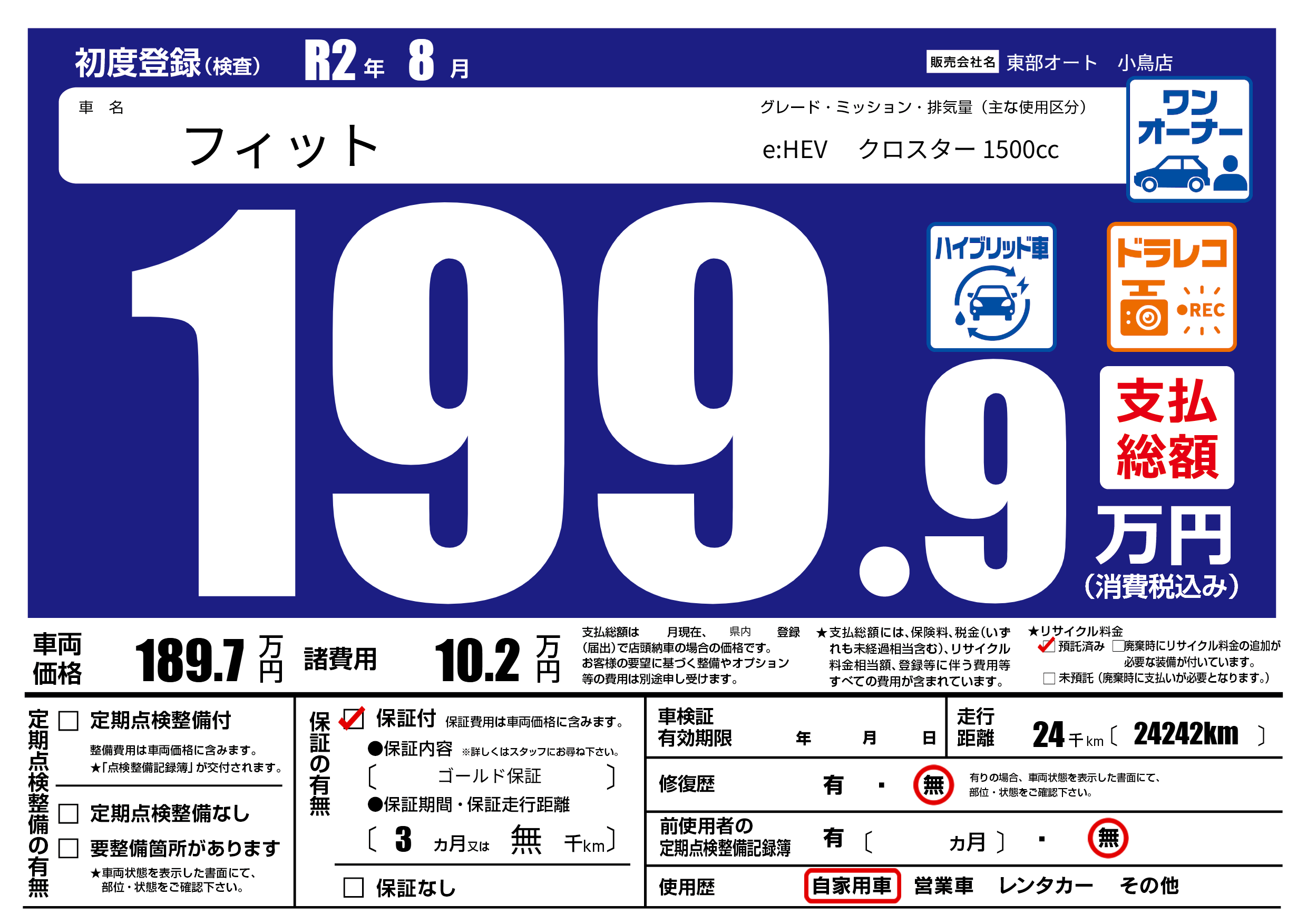| 走行キロ | 2.4万km | 初年度登録 | R2年8月 |