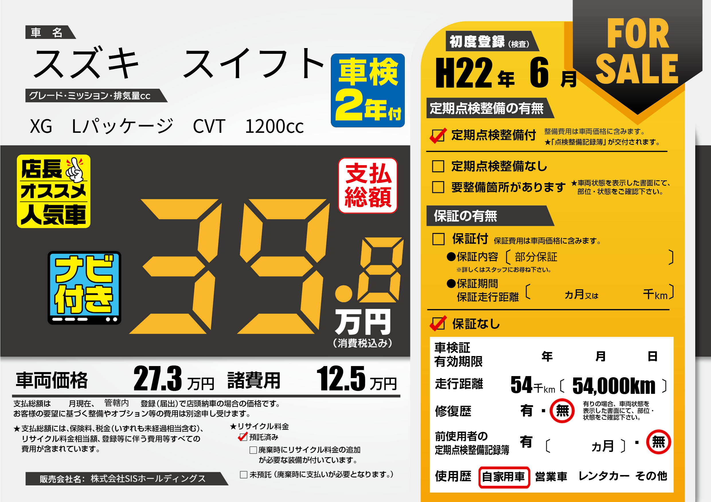 | 車名 | スズキ スイフト | グレード ミッション 排気量 |