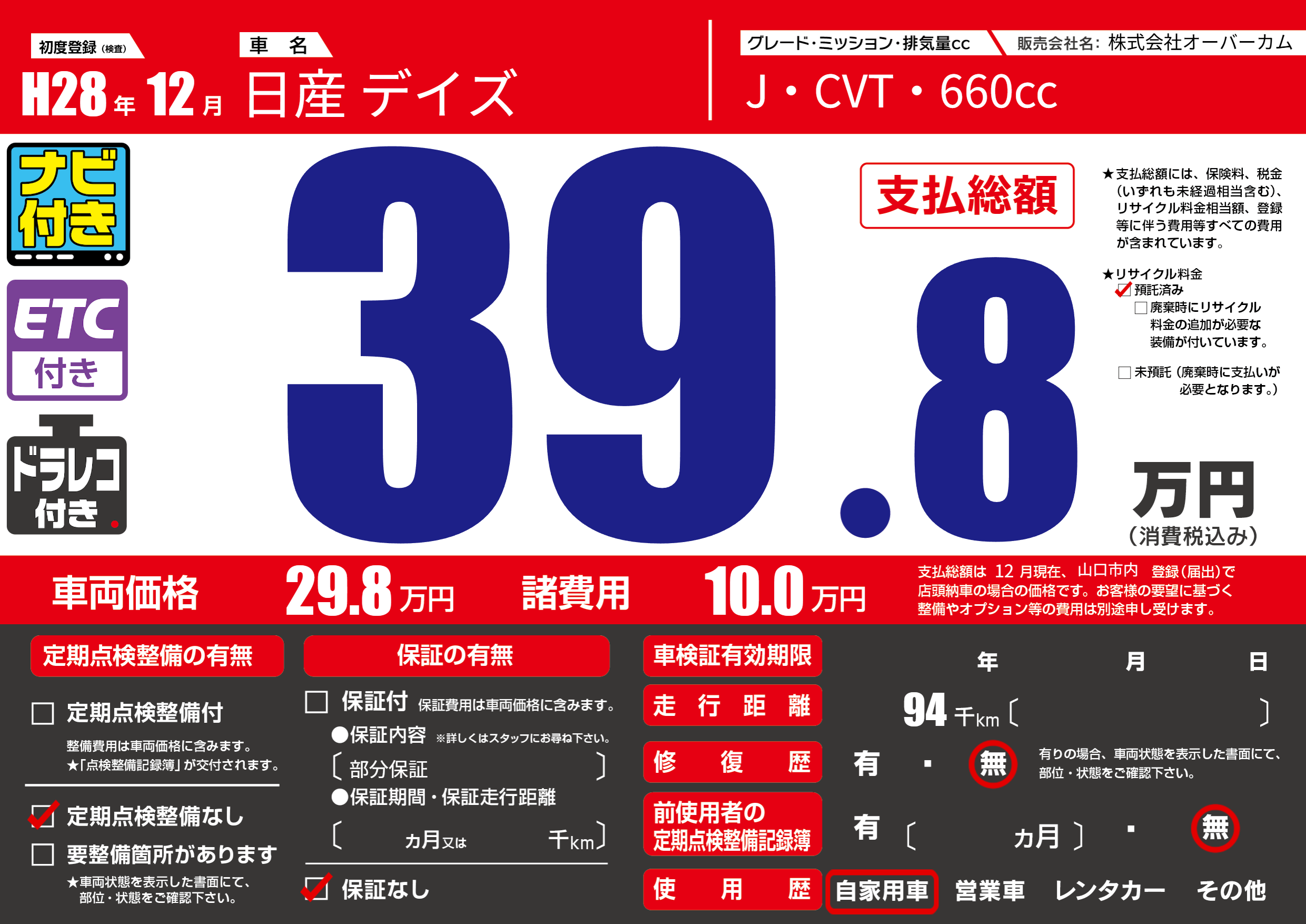 | 走行キロ | 9.4万km | 初年度登録 | H28年12月 |