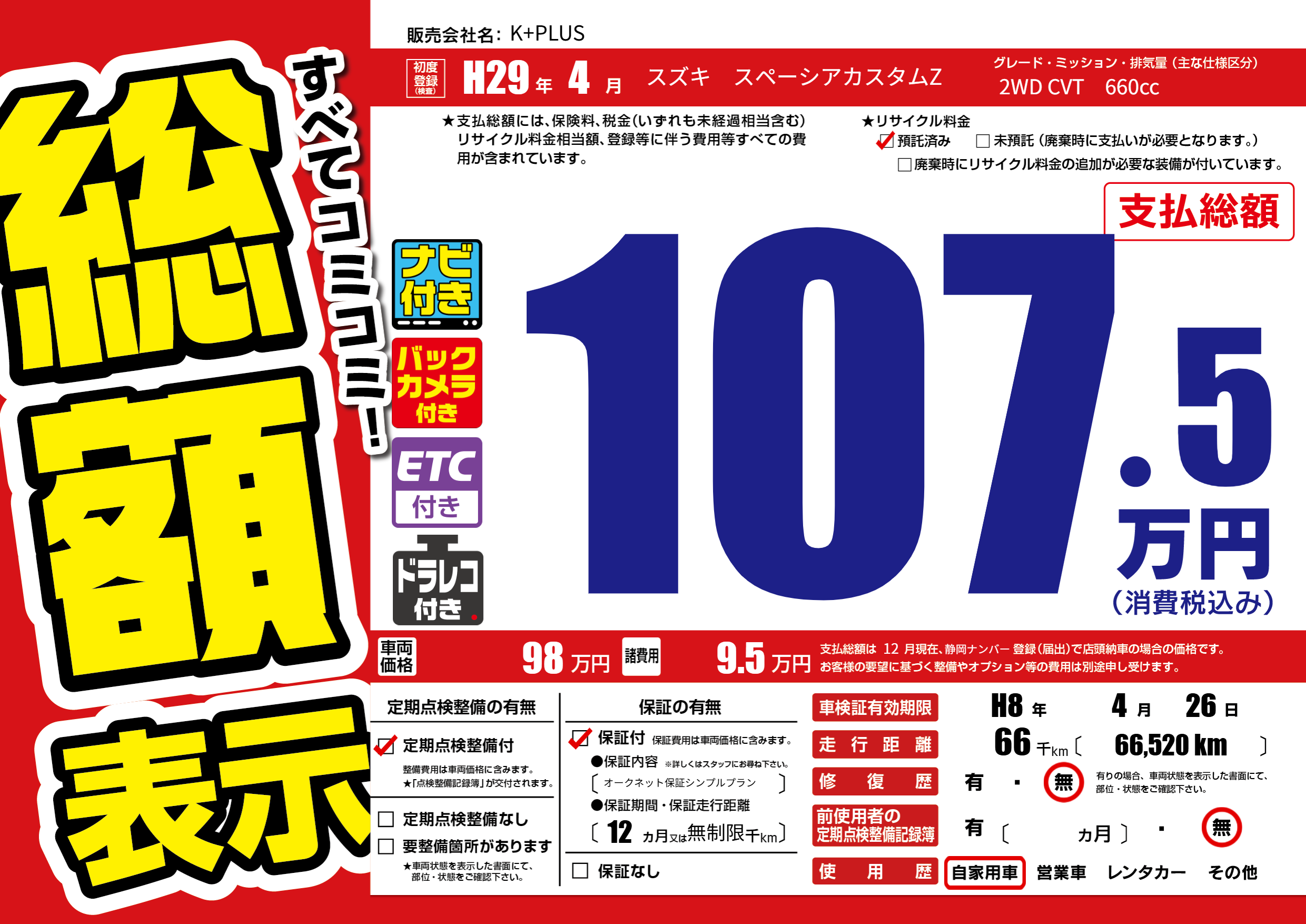 | 車名 | スズキ スペーシアカスタムZ | グレード ミッション 排気量 |