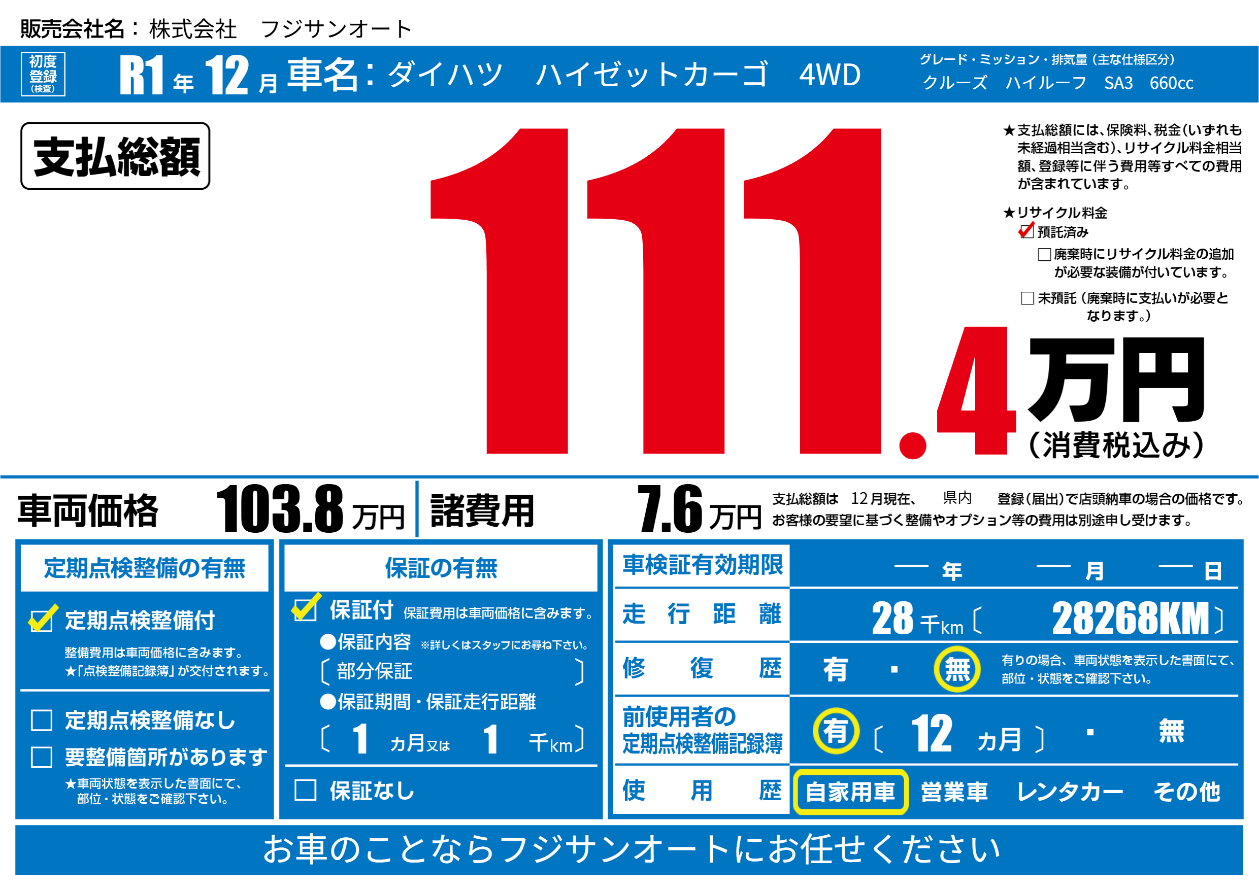 | 車名 | ダイハツ ハイゼットカーゴ 4WD | グレード ミッション 排気量 |